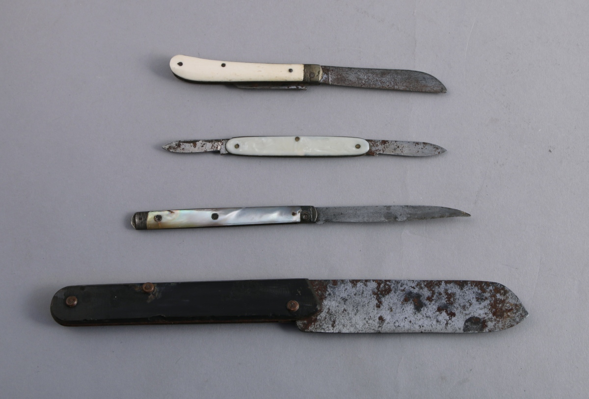 QUATRE COUTEAUX de POCHE pliables à lames, les manches en plaquettes de nacre et plaquettes de corne, d'os.