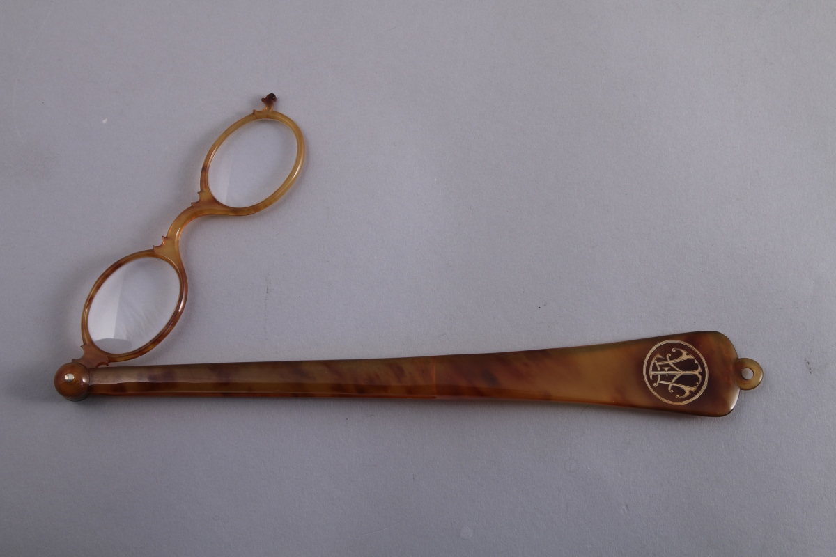 PAIRE DE LUNETTES en écaille montées sur un manche incrusté du monogramme "AF" en or ajouré.