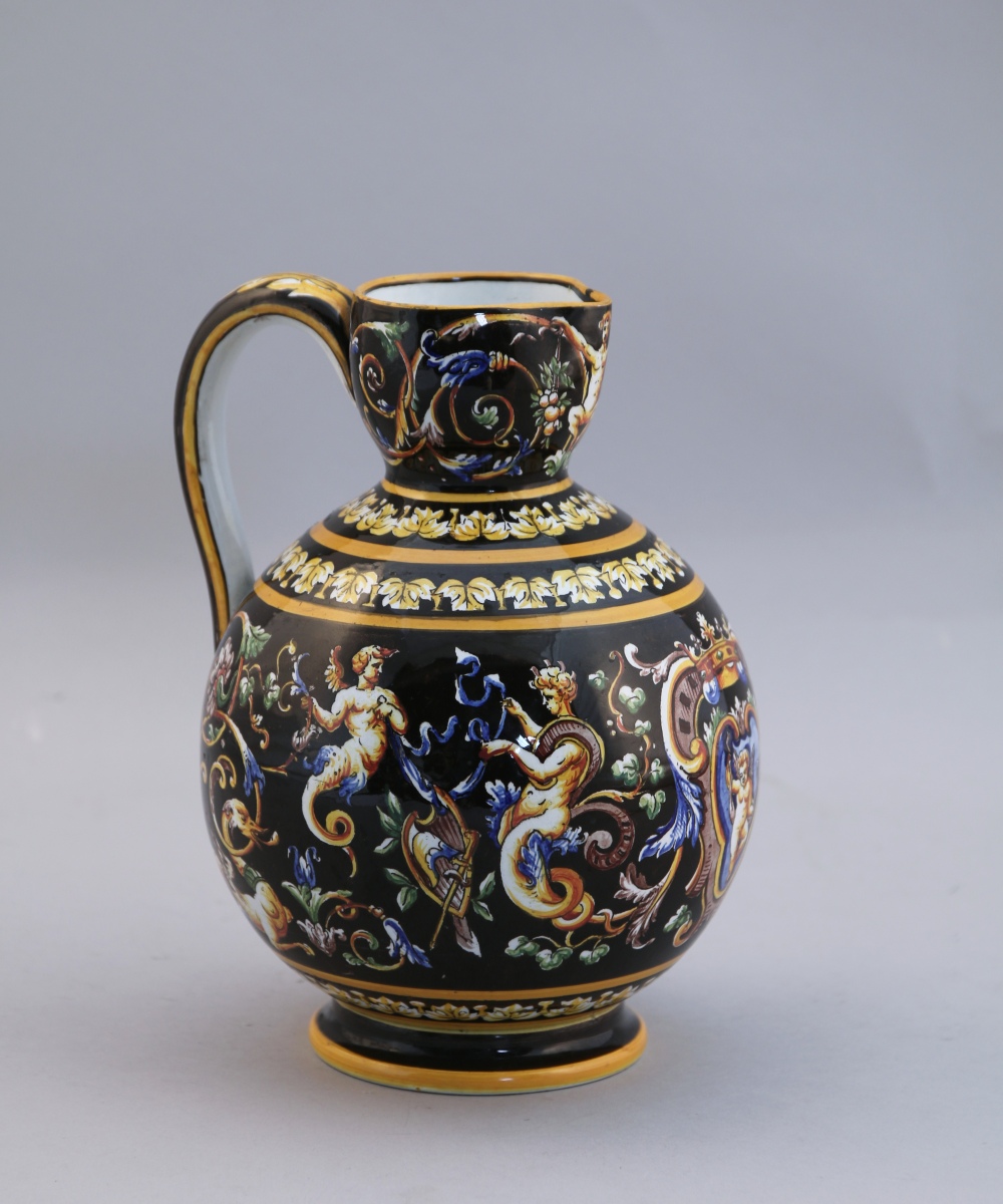 GIEN. PICHET à panse ventrue en faïence à décor polychrome dit Renaissance italienne sur fond brun représentant cupidon dans un cartouche entouré d'arabesques, de personnages à corps d'animaux, d'amours et dragons. Cachet Gien, 1866-1875.