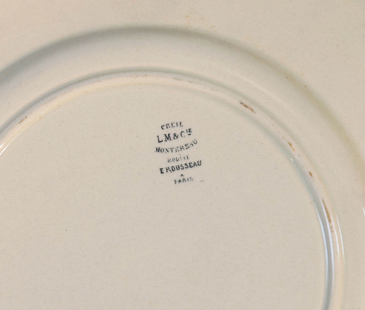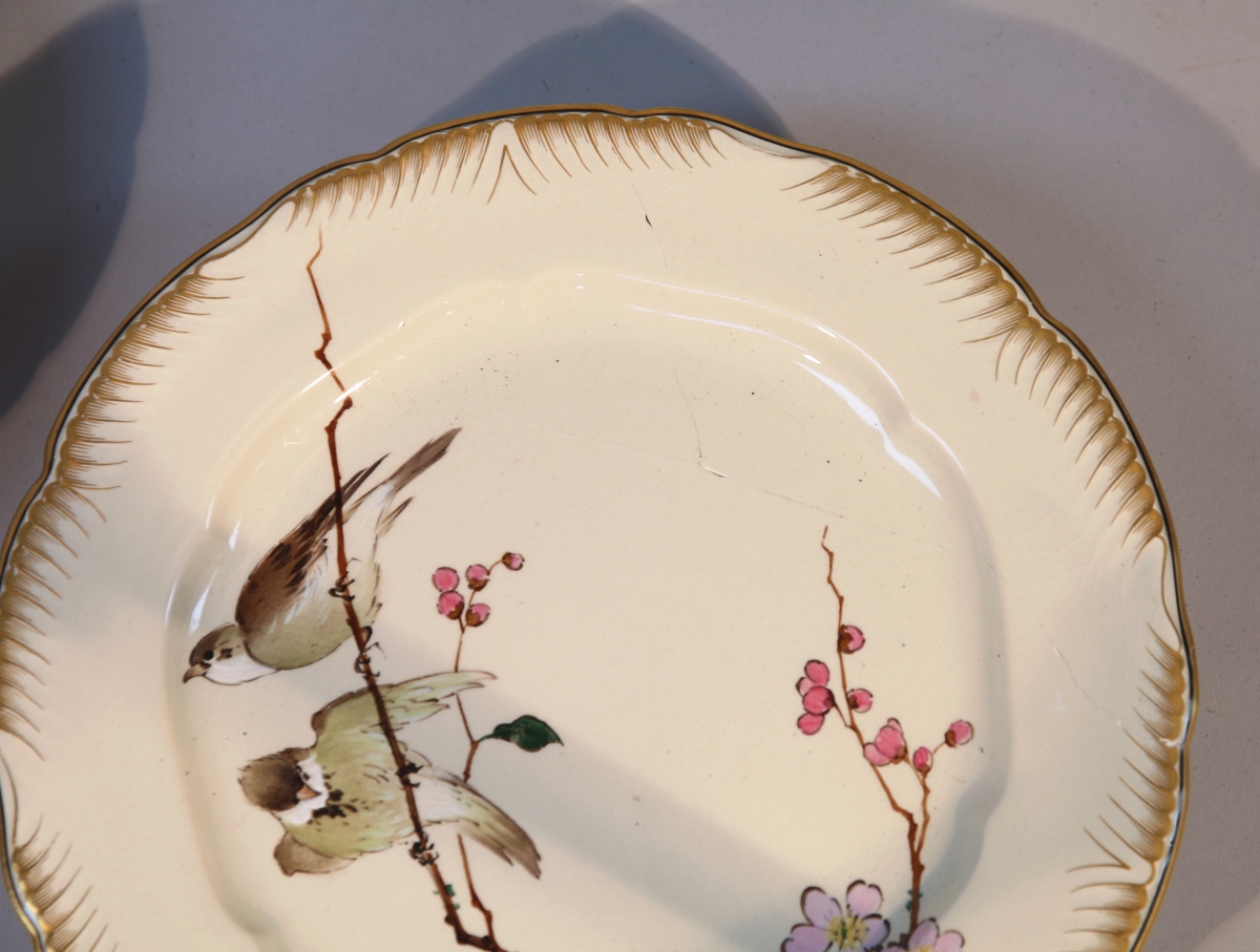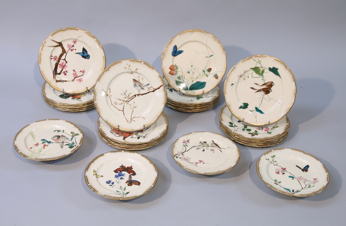 CREIL & MONTEREAU, LM&Cie. Partie de SERVICE dit WALTER-ROUSSEAU, 27 pièces, en faïence fine à décor polychrome de fleurs et de fruits animé d'oiseaux et papillons. L'aile ornée de peignés or. Il se compose de 23 assiettes plates et de quatre assiettes montées (une restaurée). Cachet.