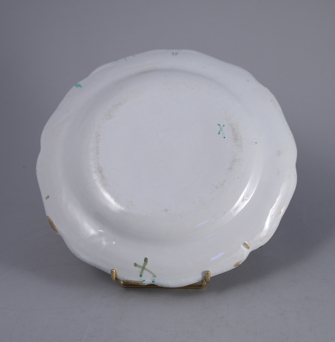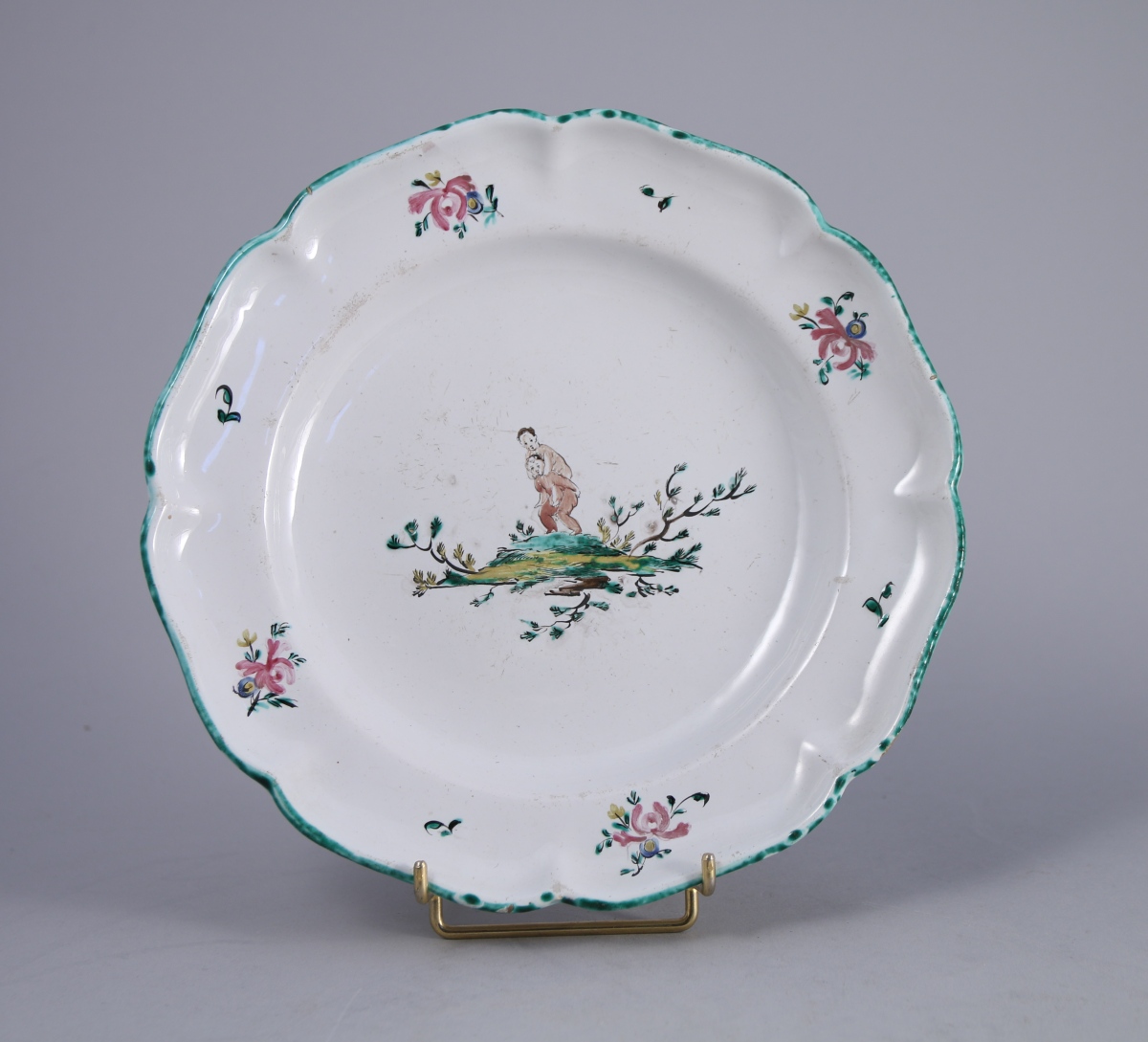 MOUSTIERS, faïence. ASSIETTE plate à décor polychrome d'un semi de bouquets de fleurs. Au centre deux enfants jouant sur un tertre rocailleux. XVIIIe.