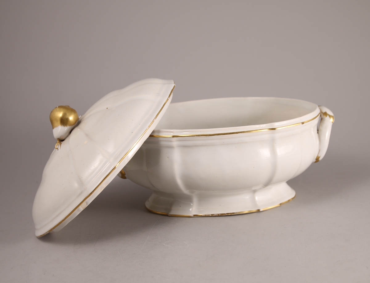 SAINT-CLÉMENT, faïence fine. TERRINE couverte de forme ovale. Prise en forme de poire. Fond blanc à rehauts or. XIXe.