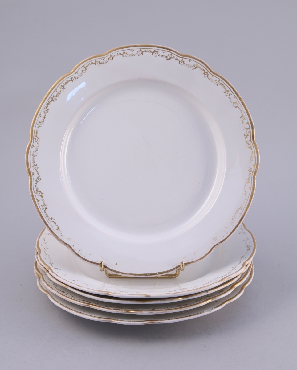 SAINT-CLÉMENT, faïence fine. CINQ ASSIETTES PLATES à fond blanc. Bordure à guirlande rocaille traitée en dorure. XIXe.