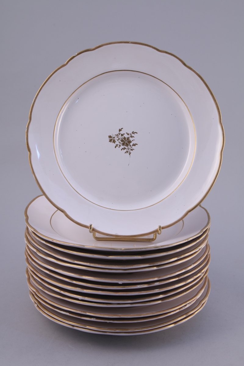 SAINT-CLÉMENT, faïence fine. Suite de 14 ASSIETTES PLATES à fond blanc. Brindille fleurie traitée en dorure au centre. Liseré doré sur la bordure. Fin XVIIIe, début XIXe.