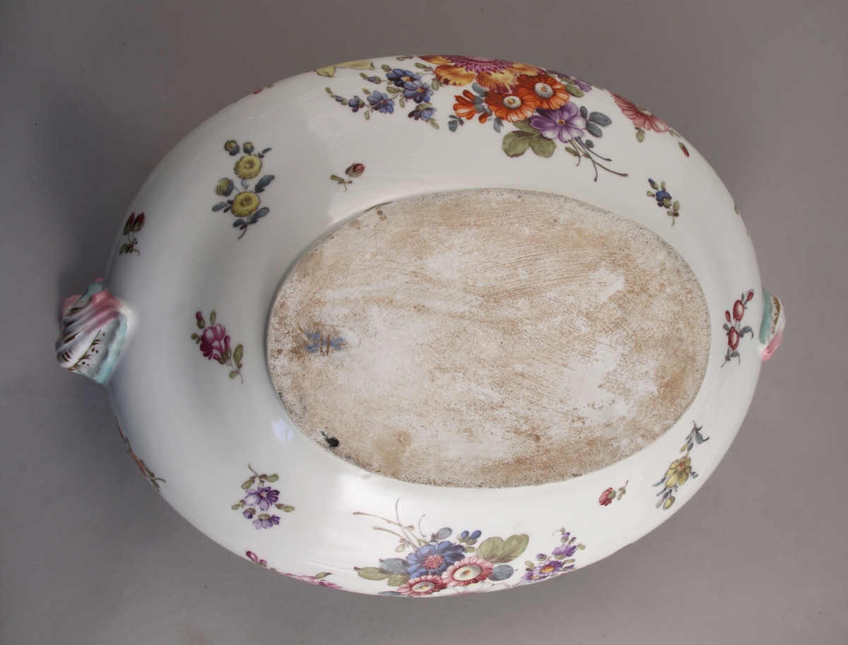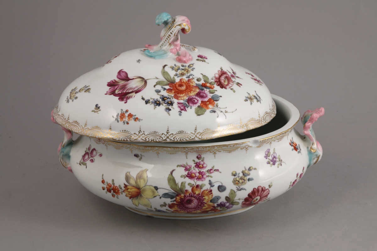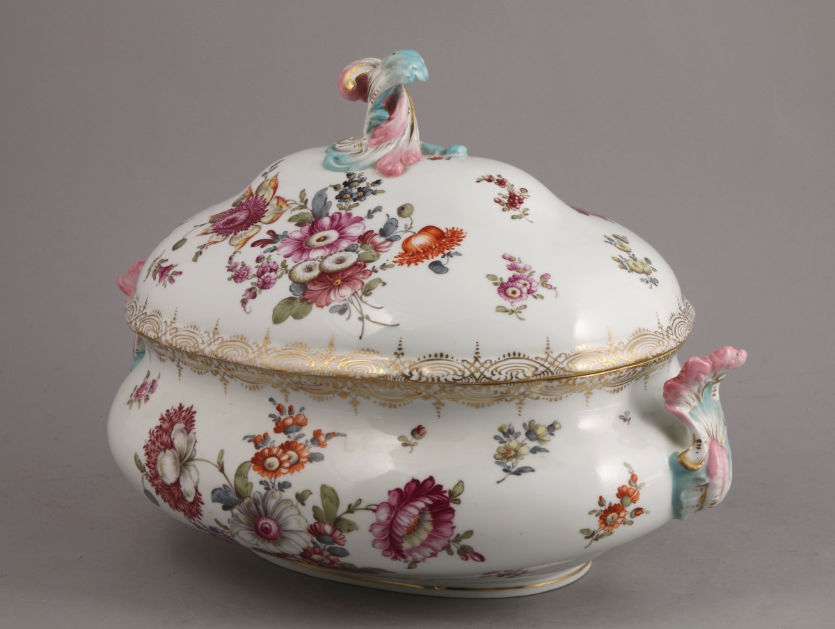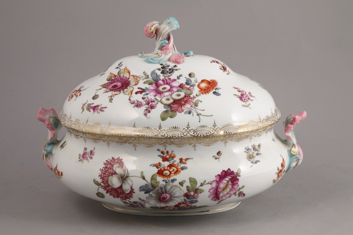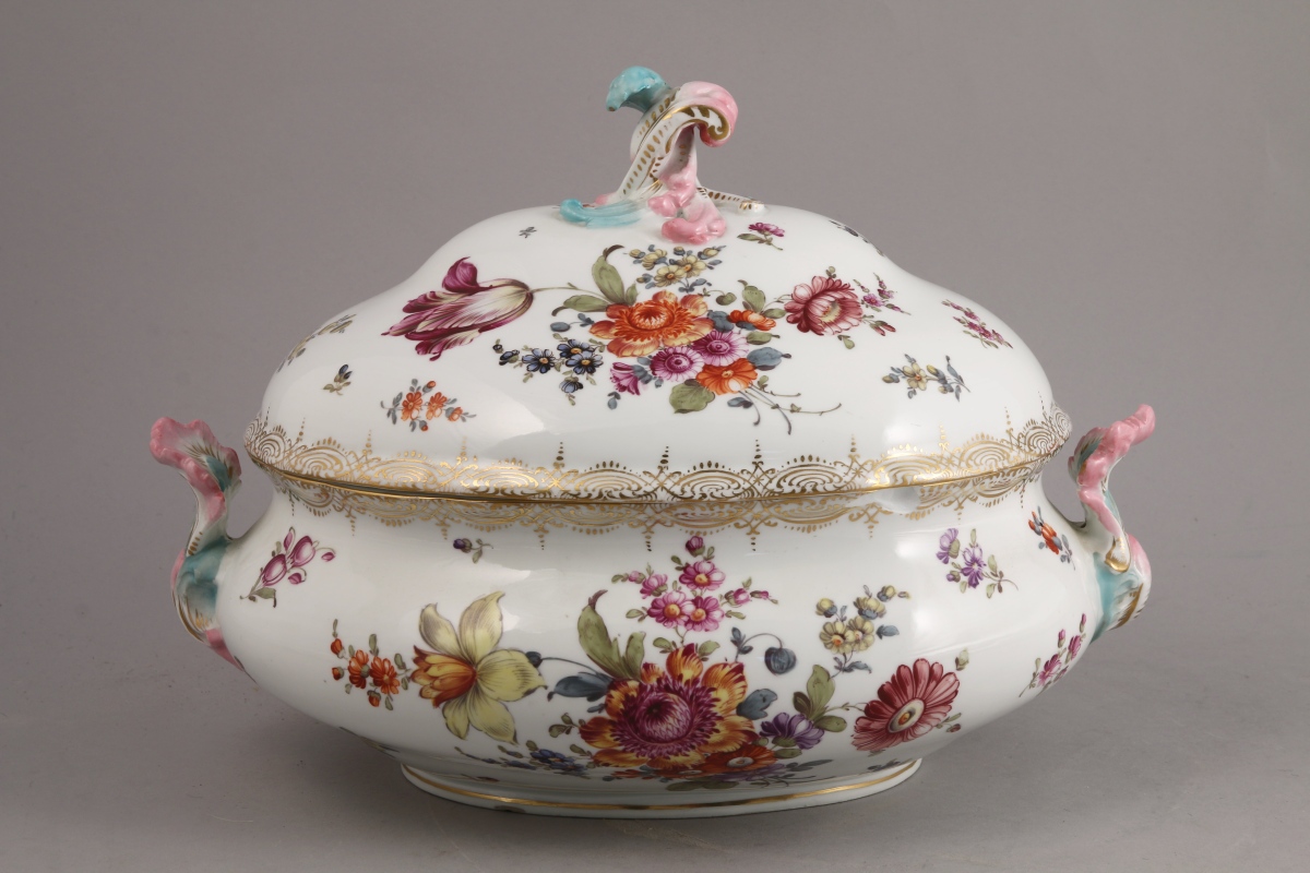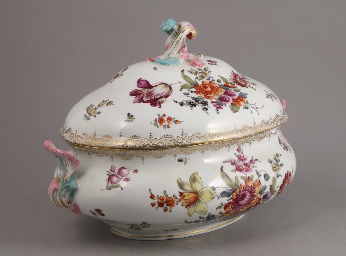 MEISSEN. SOUPIÈRE à riche décor floral polychrome au naturel. Bordures rehausées à l'or d'une frise d'agrafes et entrelacs feuillagés. Prise à enroulements, anses latérales figurant une large feuille d'acanthe.