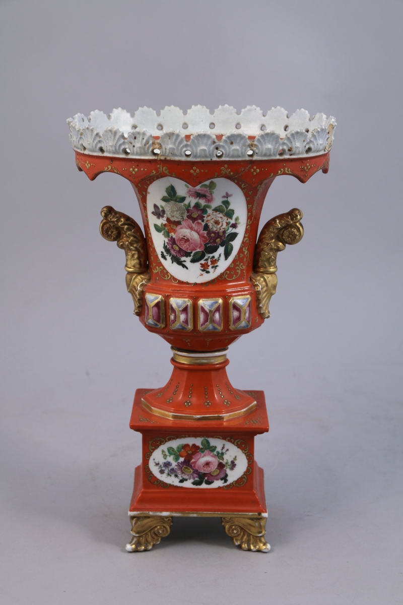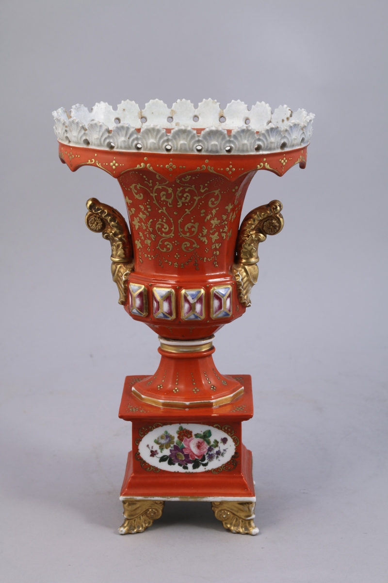 PARIS. VASE MÉDICIS à anses en porcelaine à décor polychrome et or sur fond brique de fleurs au naturel dans des cartouches, rinceaux fleuris et gemmes stylisés. Le col ceint de palmettes. Le vase repose sur un socle rectangulaire à quatre pieds à enroulements stylisés.