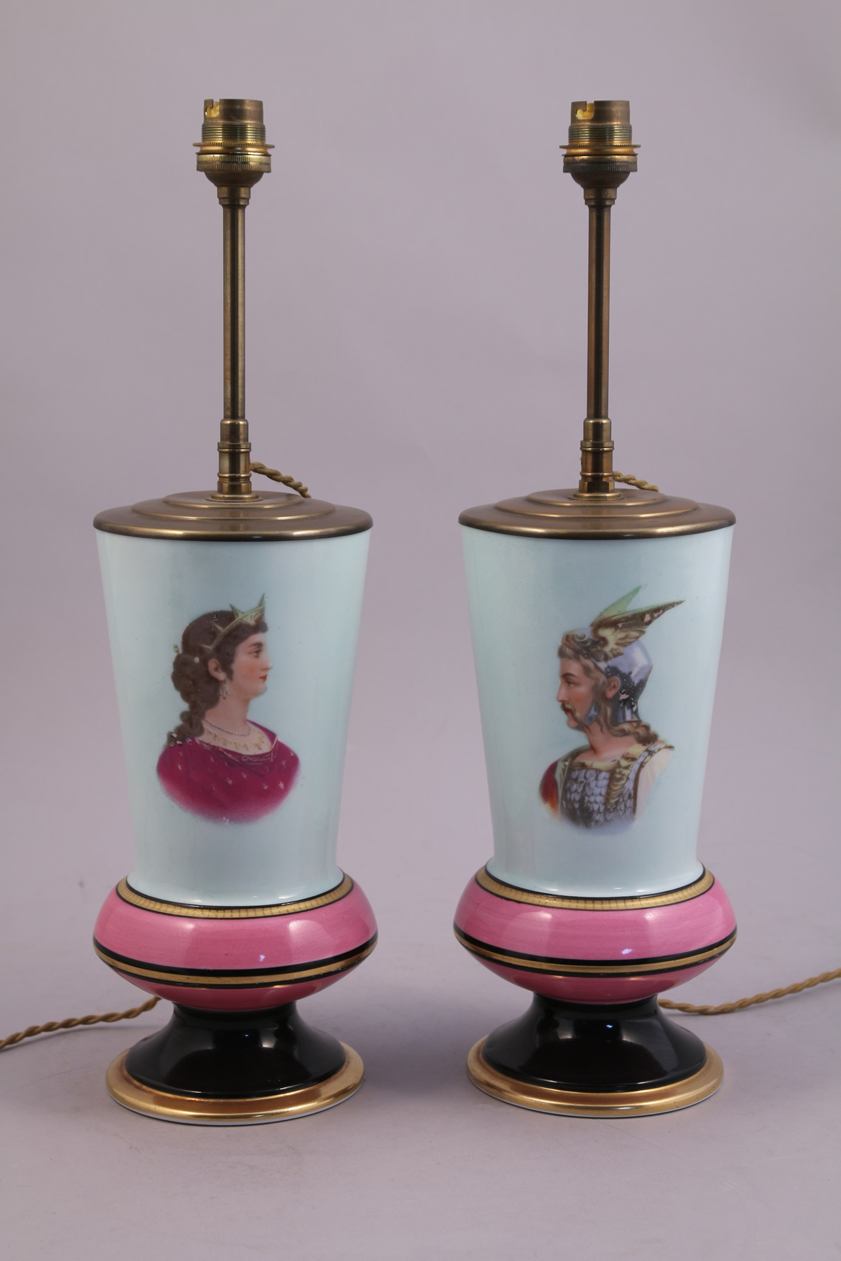 PAIRE de VASES de forme tronconique en porcelaine polychrome, à décor de bustes de profils, l'un figurant une femme couronnée, l'autre un guerrier gaulois. Montés en lampe.