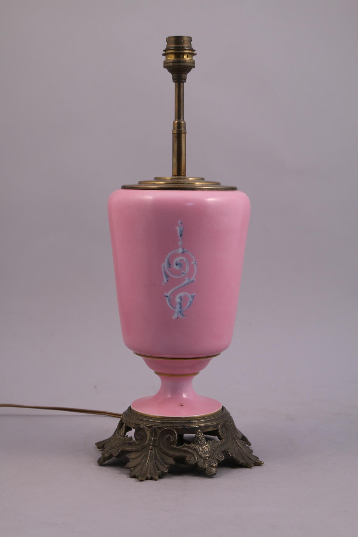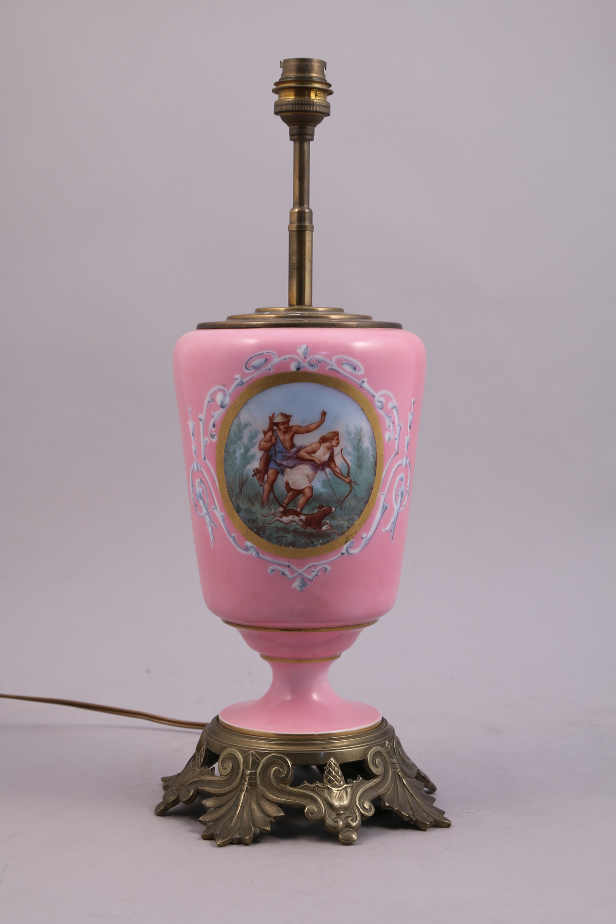 JOINT: VASE en porcelaine rose, orné d'un cartouche représentant "Diane chasseresse", sur un socle en laiton figurant des palmettes. Monté en lampe. Haut. 26 cm.