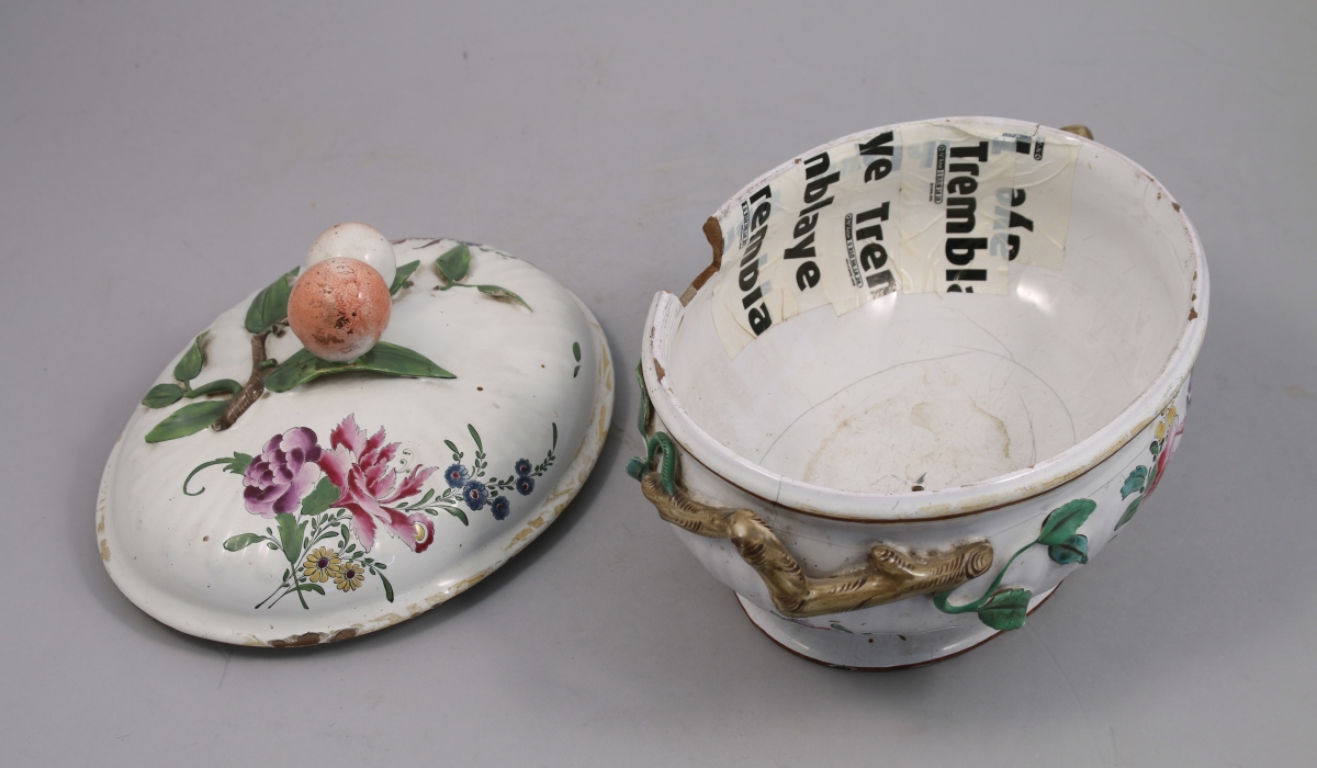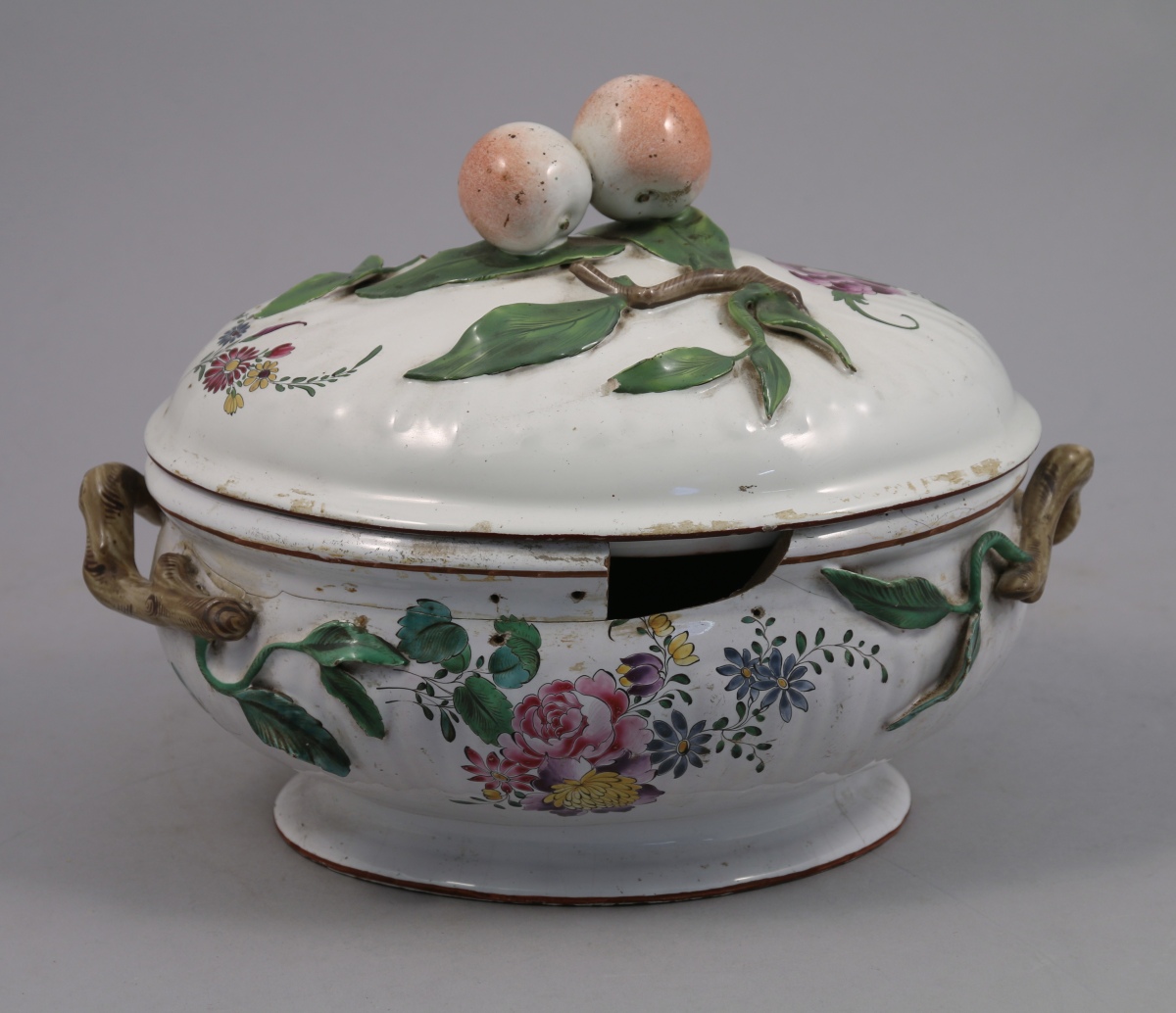 STRASBOURG. SOUPIÈRE à légers godrons reposant sur un piédouche, en faïence à décor polychrome chatironné de fleurs au naturel. Les anses formées par des branches en haut-relief. La prise du couvercle en forme de mirabelles sur une branche.