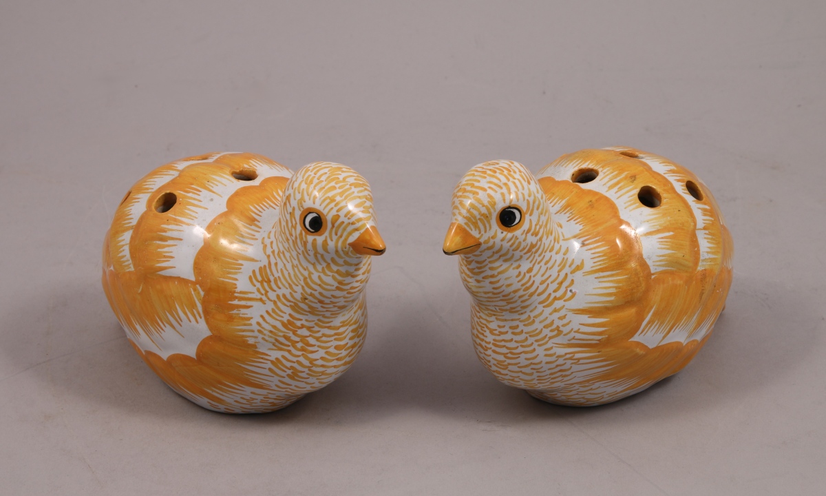 ESPAGNE. PAIRE de PIQUE-FLEURS en forme de PERDREAUX en faïence polychrome. Marques au revers.