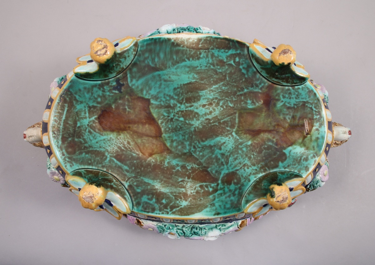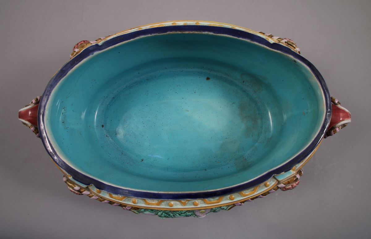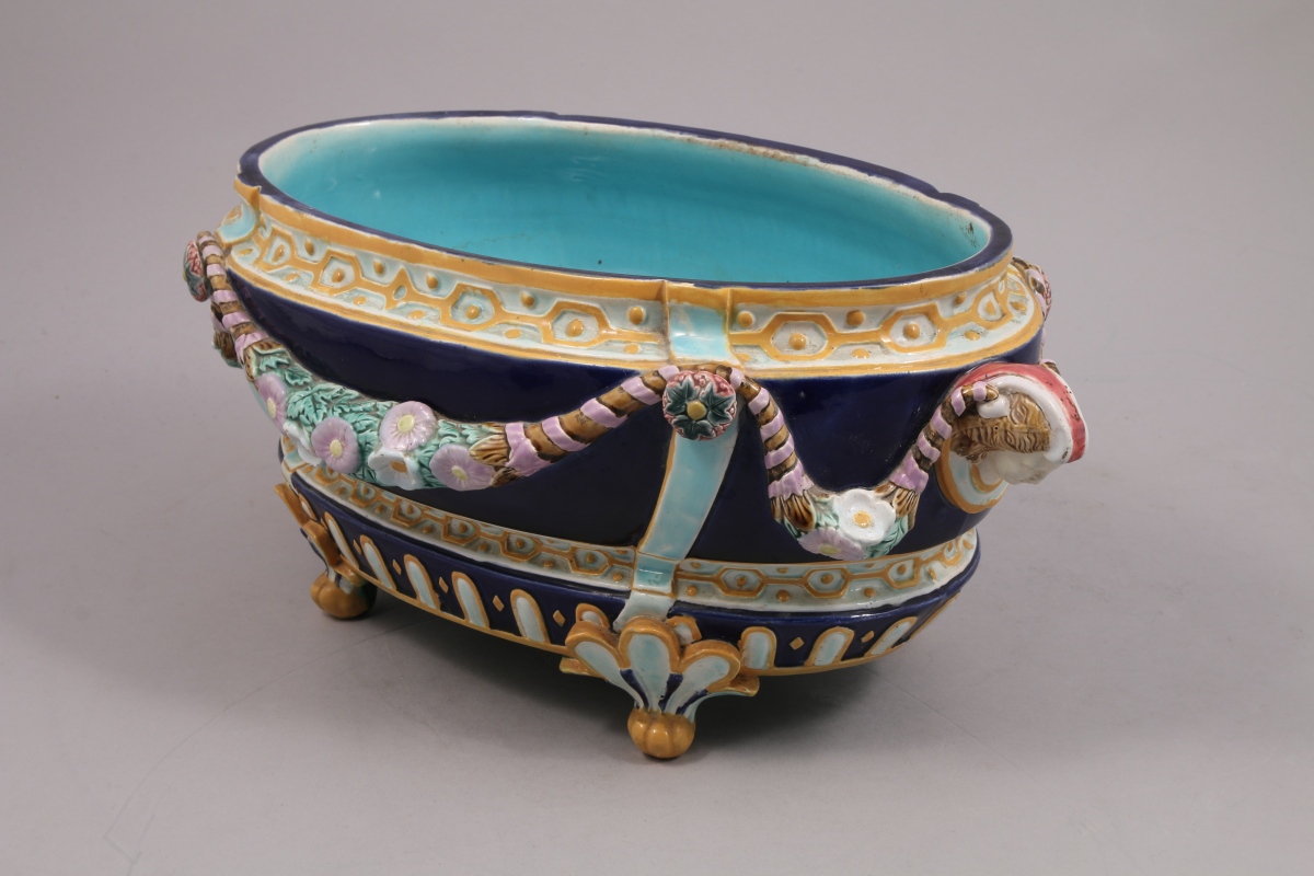 Joseph HOLDCROFT (act. 1870-1885). JARDINIÈRE de forme oblongue en barbotine polychrome. La panse à fond cobalt, ornée de guirlandes de fleurs retenues par des boutons de fleurs et des têtes de femmes formant prises. La jardinière repose sur quatre pieds griffes à palmettes. Marque "J.HOLDCROFT" en creux au revers.