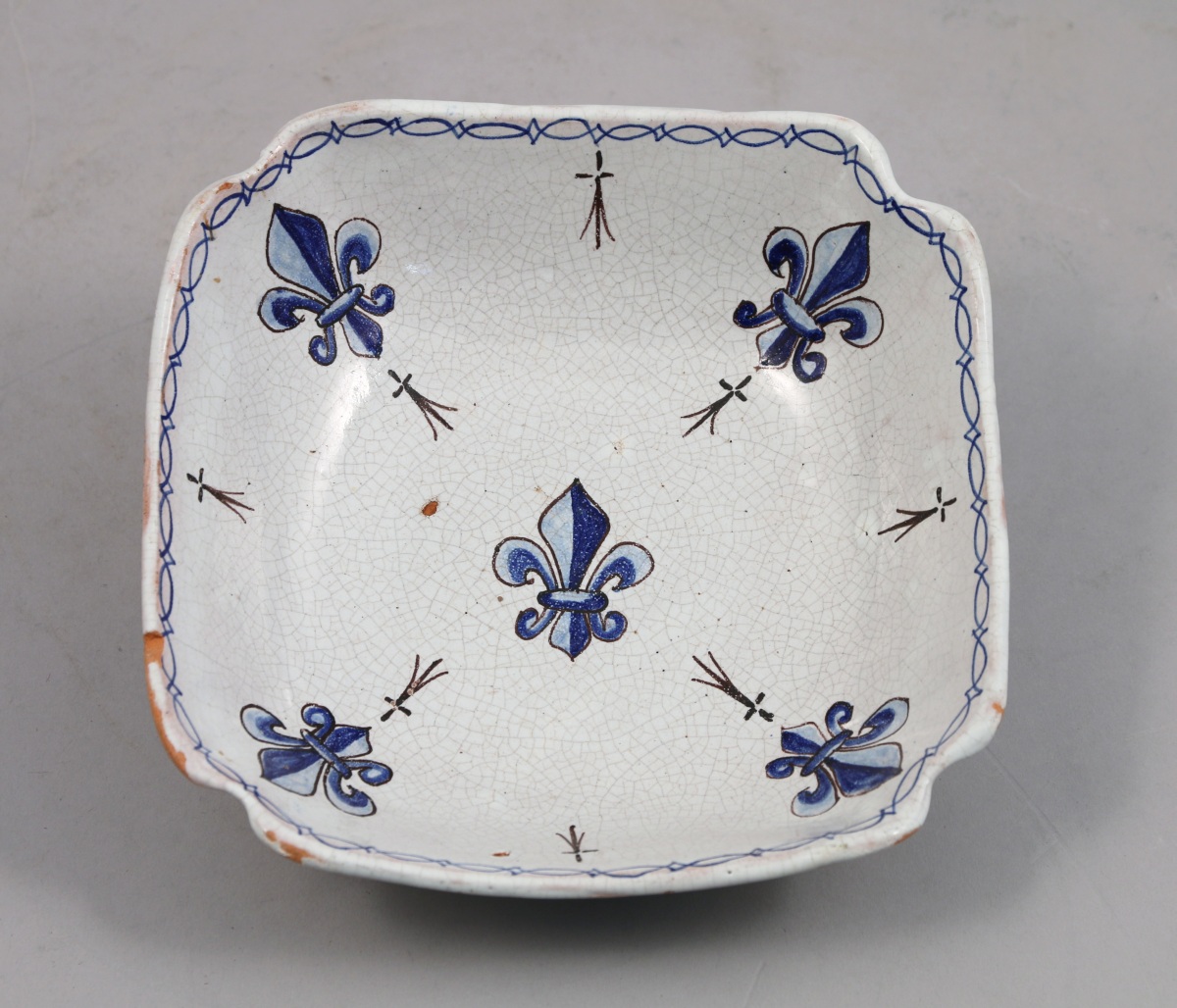 MALICORNE. COUPE creuse de forme carrée en faïence polychrome. Décor de semis de fleurs de lys et pattes d'hermine. Le talon circulaire. Marque au revers "PB" pour Pouplard-Beatrix.