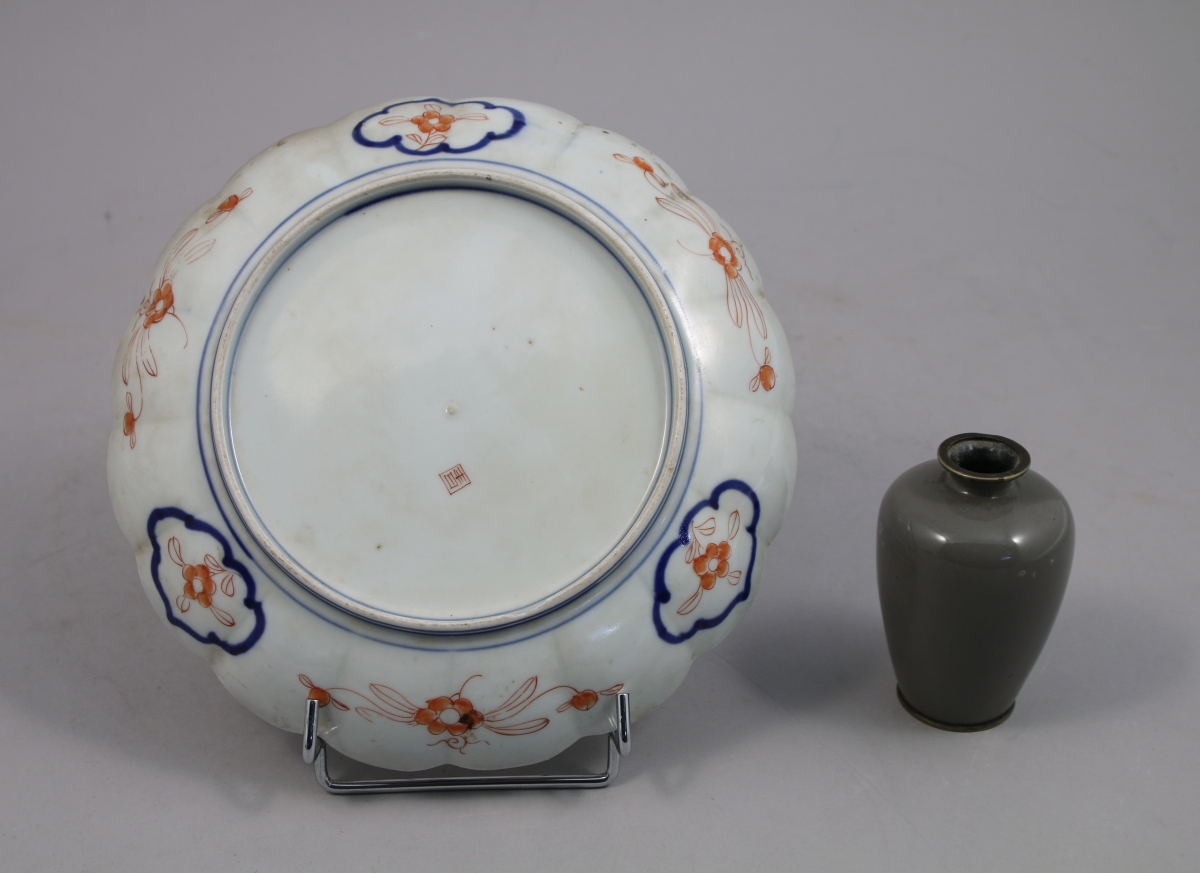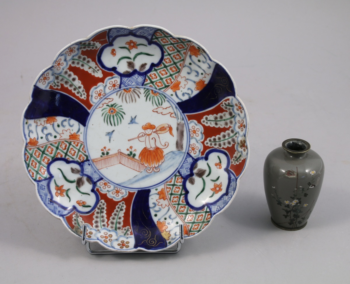 - ASSIETTE de forme ronde à bordure polylobée en porcelaine polychrome. Médaillon central à décor d'un personnage dans un jardin, le marli orné de fleurs dans des cartouches. Une marque au revers. Dans le goût du Japon, XXe. Diam. 21 cm.