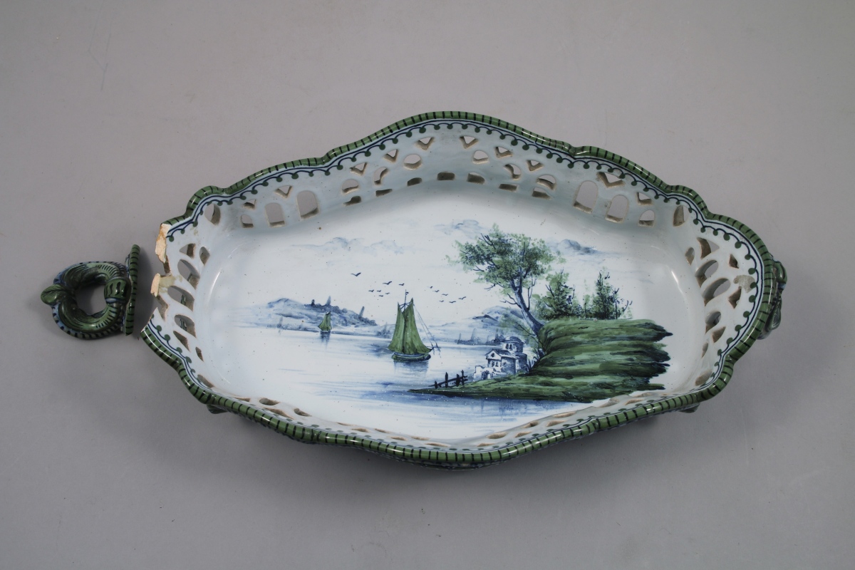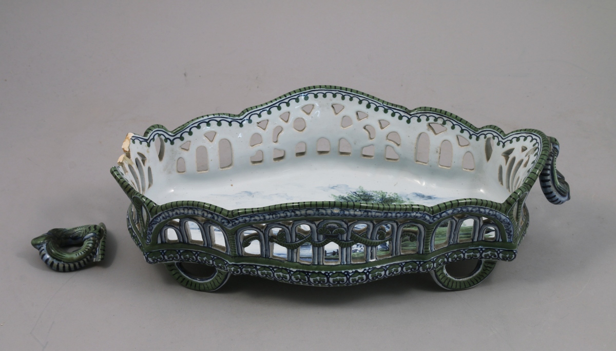 SAINT-CLÉMENT. JARDINIÈRE de forme oblongue à anses fixes en faïence polychrome. Les bords ajourés chantournés. Le fond à décor d'un paysage lacustre. Piètement quadripode. Marque au revers "K & G" pour Keller et Guérin.