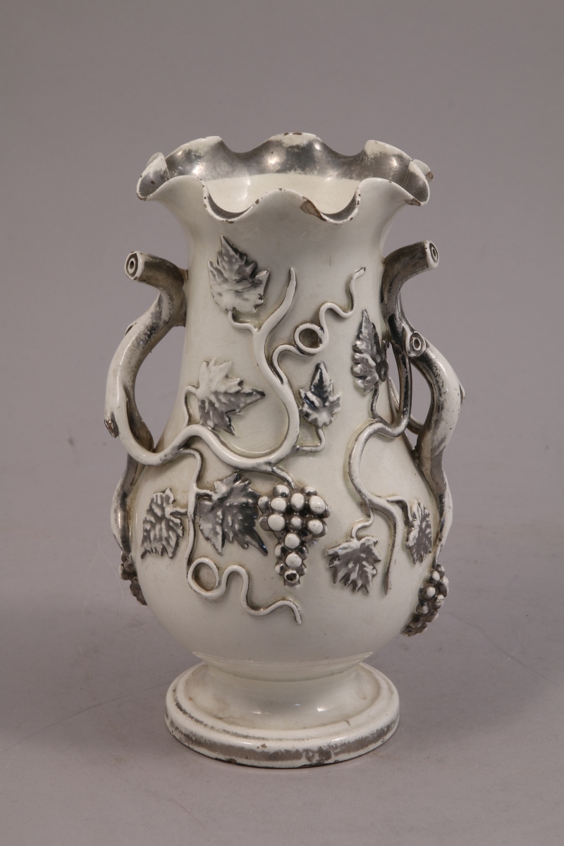 LANGEAIS. VASE sur piedouche à col polylobé, en faïence fine à fond blanc crémeux. Décor à rehaut de platine de pampres et feuilles de vignes. Les anses fixes formées par les branches. Cachet "CH. de BOISSIMON & Cie/ Langeais Indre & Loire." en creux dans un cartouche sous la base.