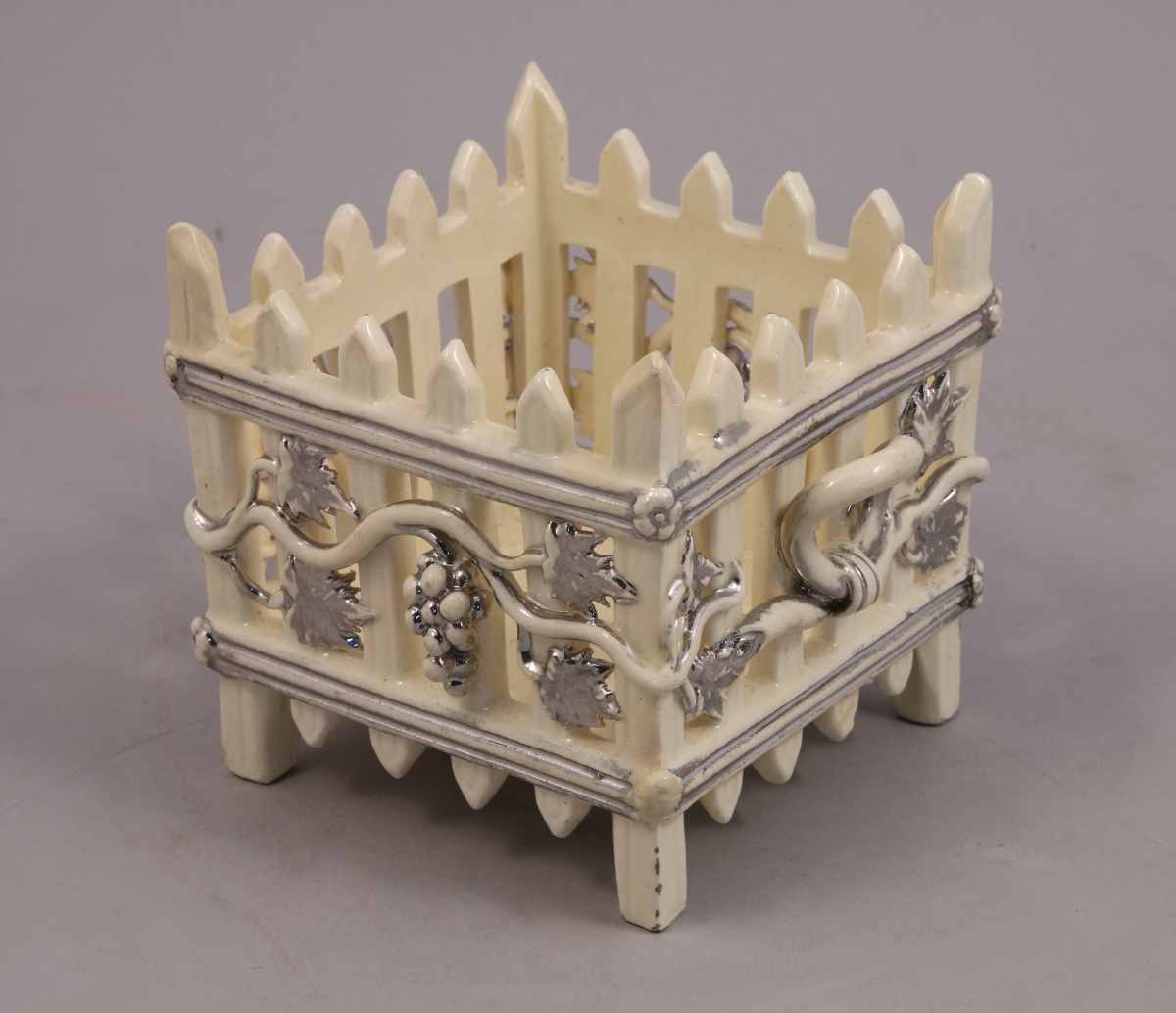 LANGEAIS. JARDINIÈRE de forme carrée à anses fixes, modèle palissade, en faïence fine à fond blanc crémeux. Décor à rehaut de platine de pampres et feuilles de vignes. Elle repose sur quatre pieds.