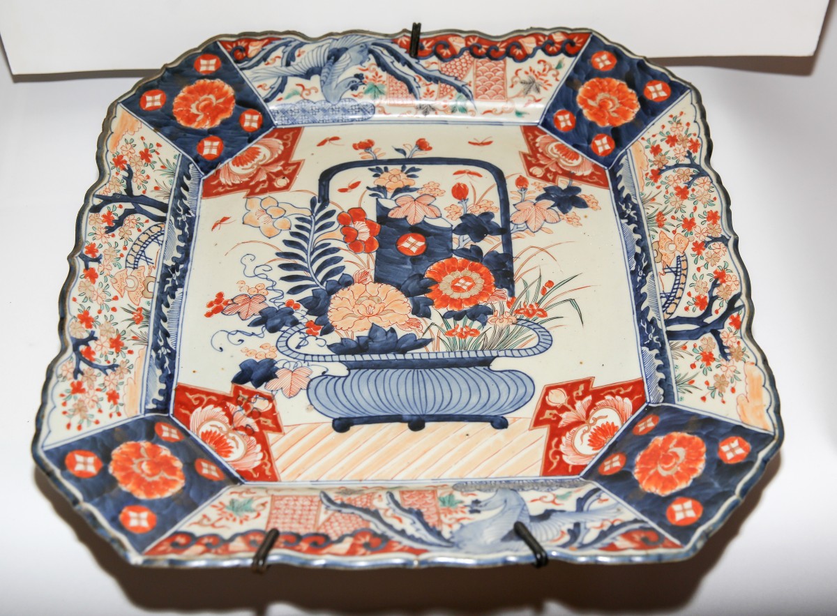JAPON, XVIII-XIXe. Grand PLAT de forme qadrangulaire en porcelaine à décors kakiemon d'un bouquet de fleurs sur fonds blanc, les ailes ornées de phénix et cerisiers en fleurs dans des réserves. Bords chantournés.