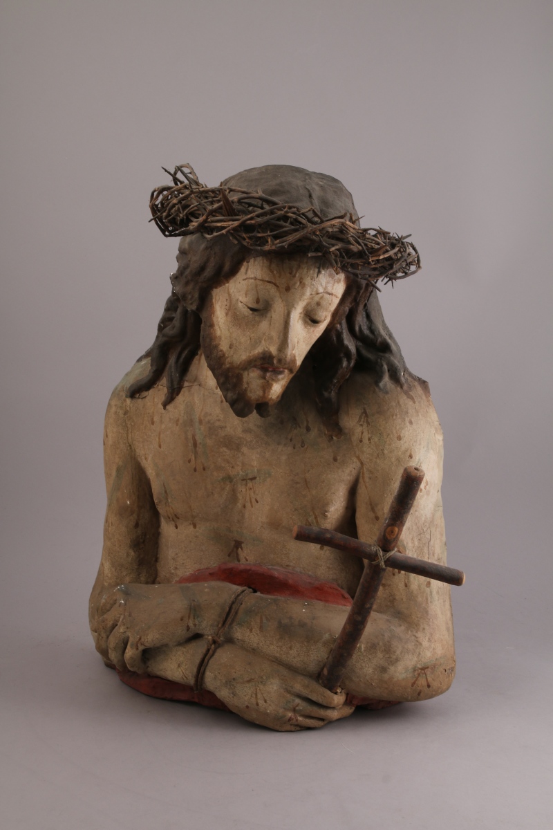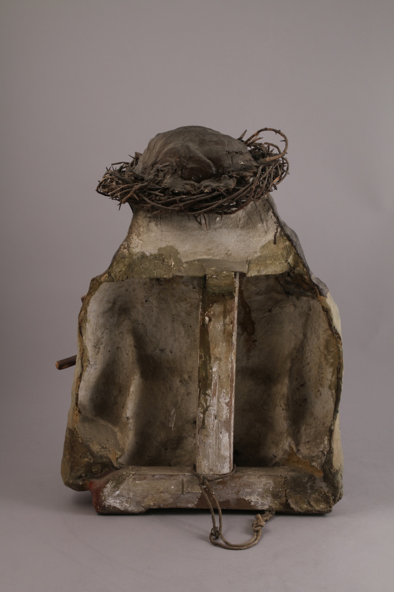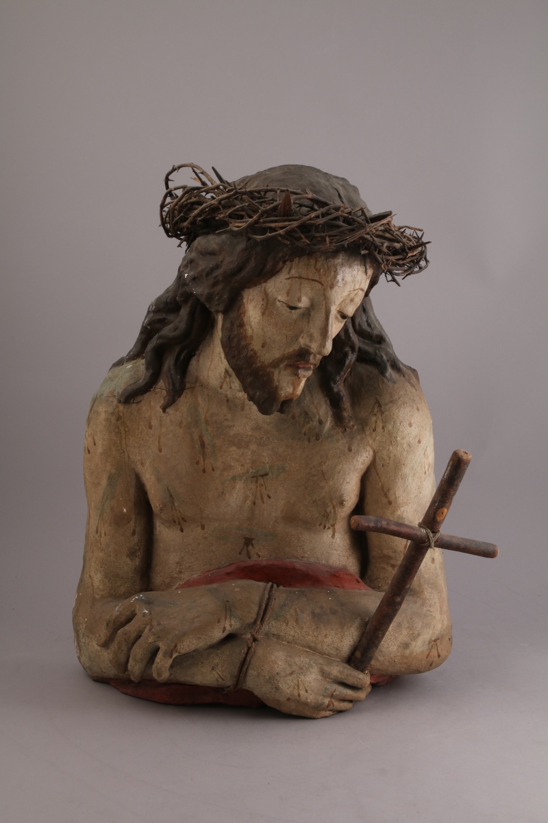 CHRIST aux LIENS. Moulage en papier mâché peint au naturel. Le Christ ceint de la couronne d'épine en aubépine et vêtu de la pourpe tient une croix.