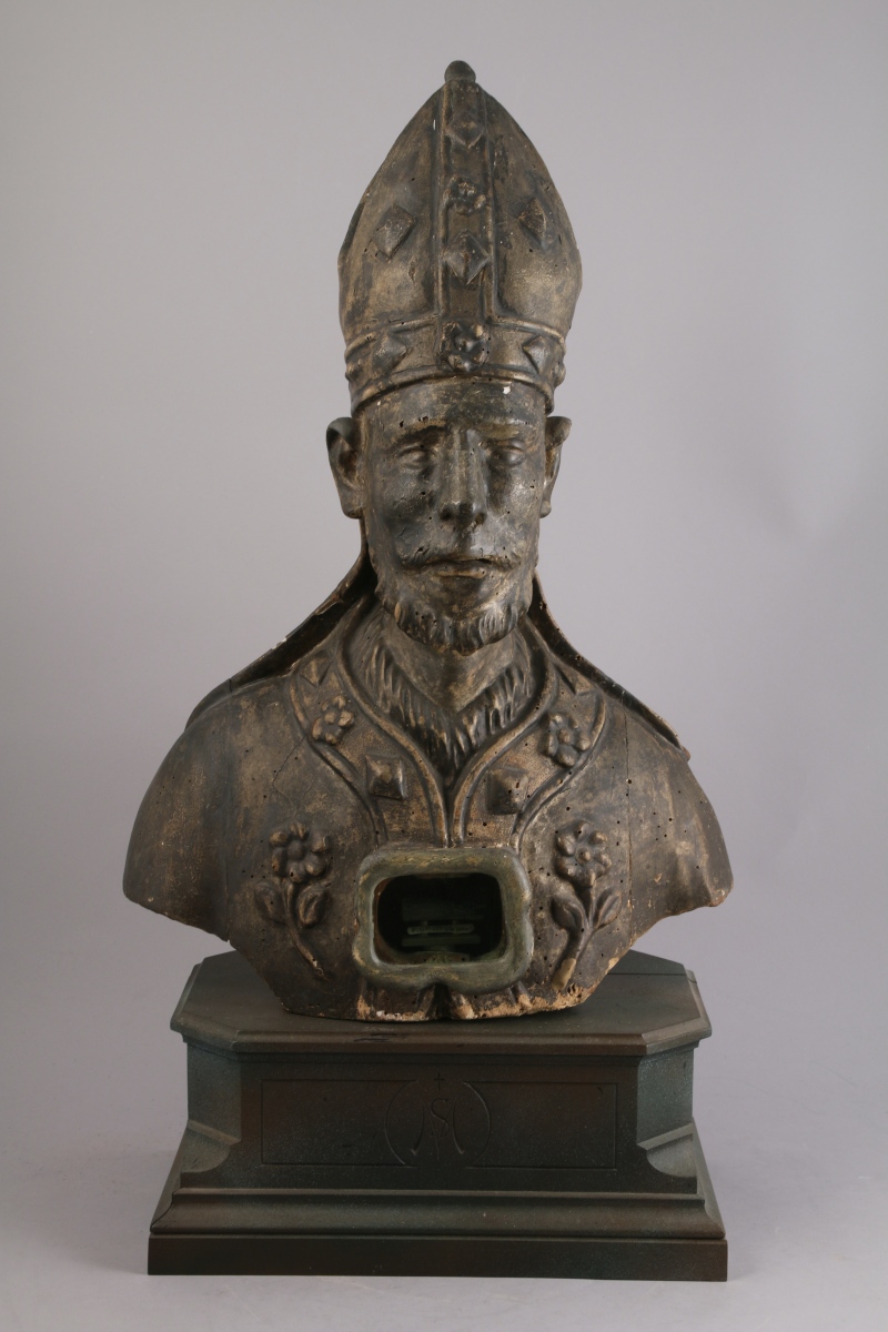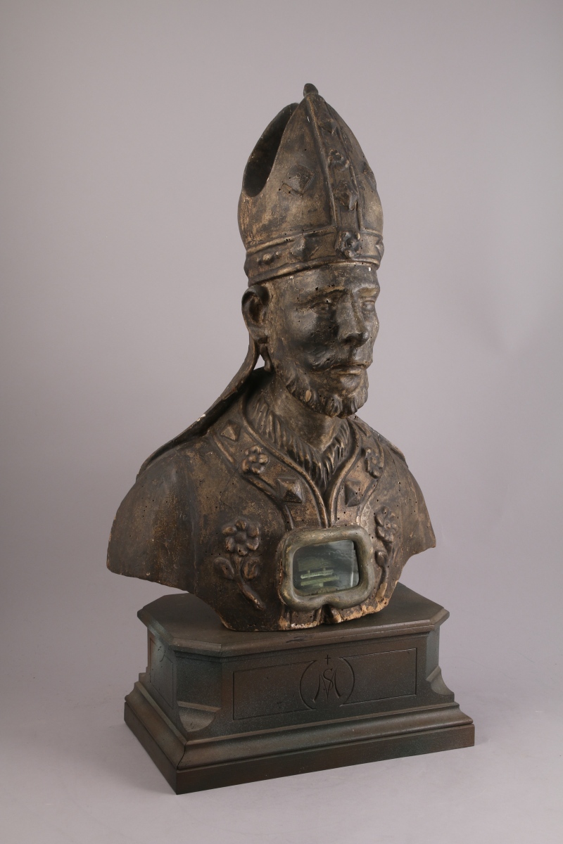 BUSTE RELIQUAIRE d'ÉVÊQUE en bois sculpté et peint, la mitre et le vêtement à décor de fleurs et losanges. Contenant une relique portant l'inscription "fragment- la crois".