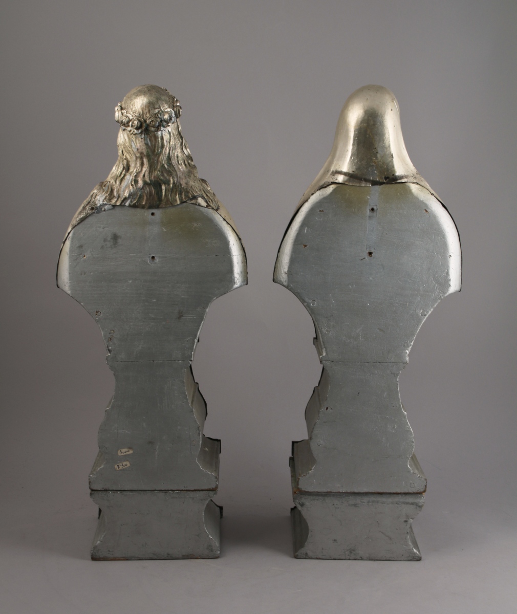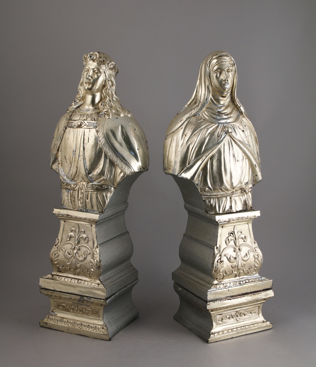 PAIRE de BUSTES en métal repoussé laqué or sur une âme de bois argenté. Les bustes en gaines représenteraient sainte Thérèse d'Avila et sainte Rose de Lima. Ils reposent sur des socles à décor de rinceaux feuillagés et frises d'oves.