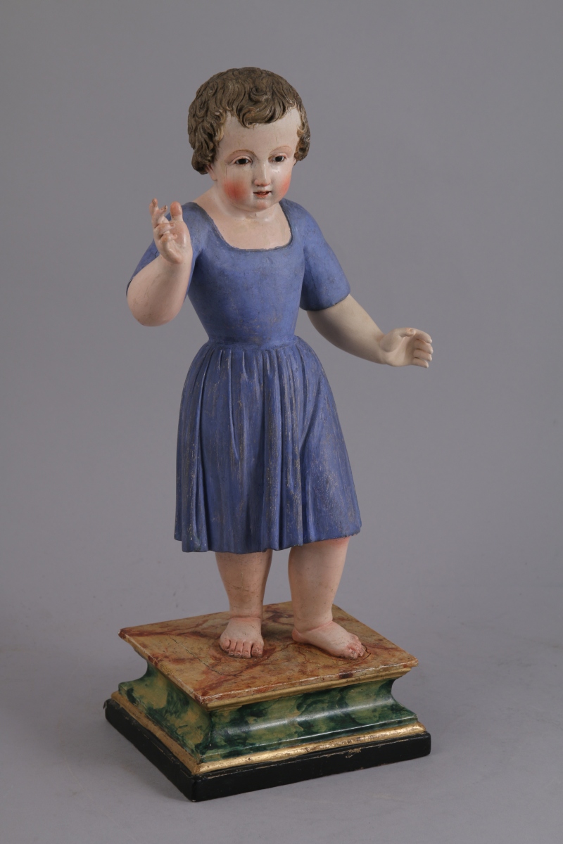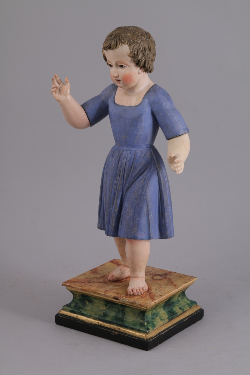 CHRIST ENFANT BÉNISSANT. Statuette en bois sculpté polychrome et relaquée, les yeux en verre. Le Christ debout, vêtu de bleu reposant sur un socle rectangulaire peint à l'imitation du marbre.