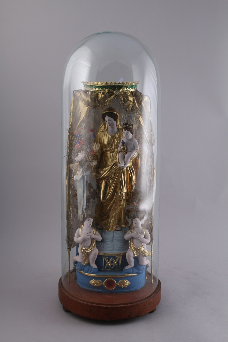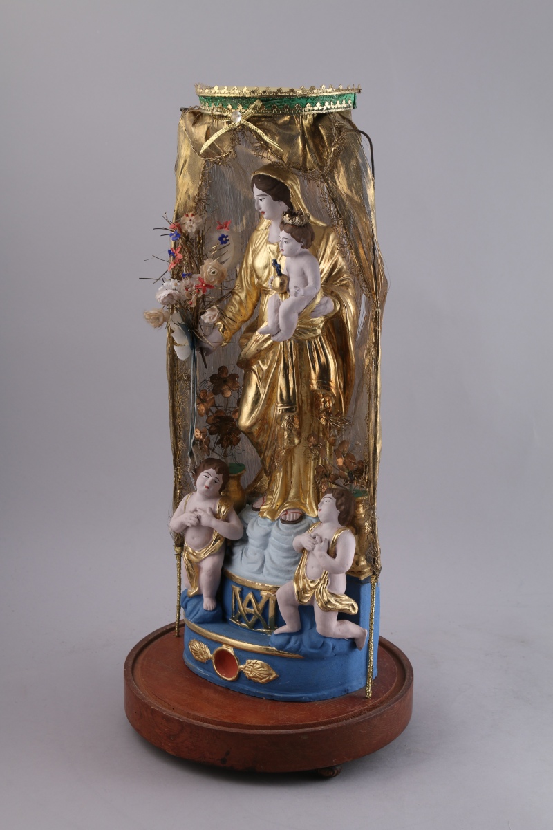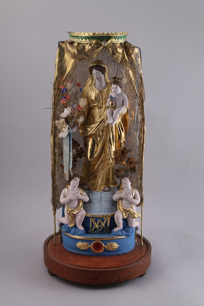 VIERGE A L'ENFANT en terre cuite polychrome. La sainte Vierge drapée d'or porte sur son bras gauche le Christ couronné tenant l'orbe, dans sa main droite un bouquet fleuri en tissu et une prière "En souvenir de Lourdes". Marie debout sur un nuage, flanquée de deux vases fleuris, adorée par deux angelots drapés. Le groupe sous un dais repose sur une base étagée au monogramme marial, le socle en bois à quatre pieds sous son globe en verre.