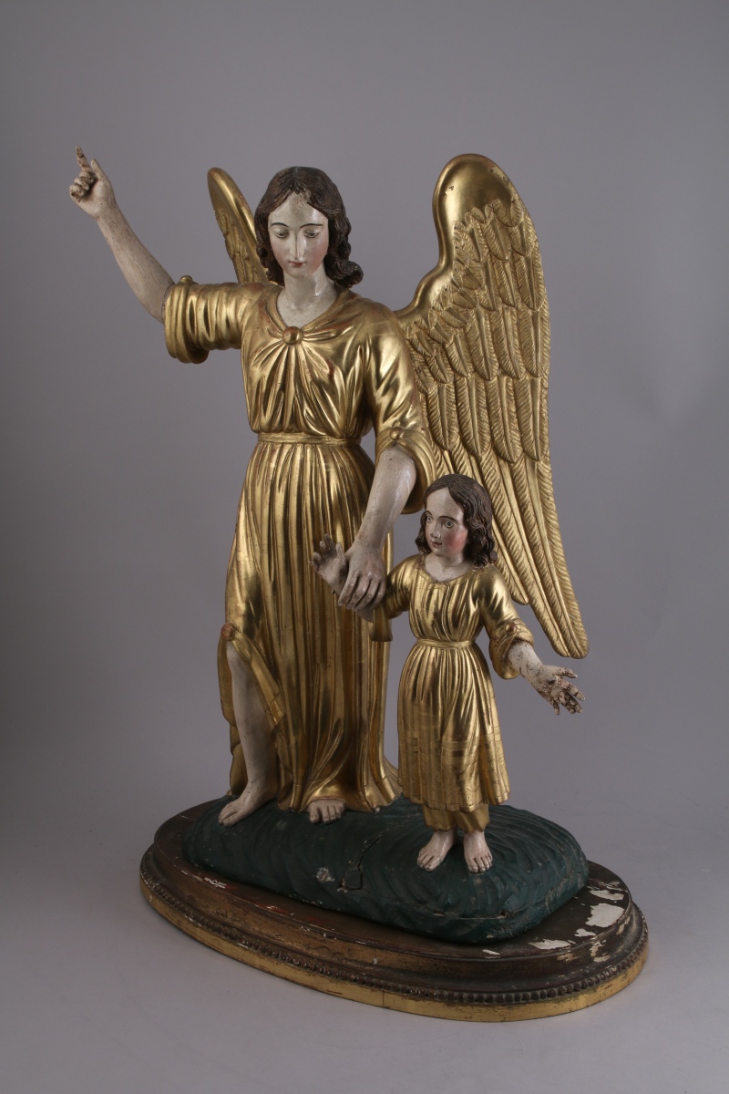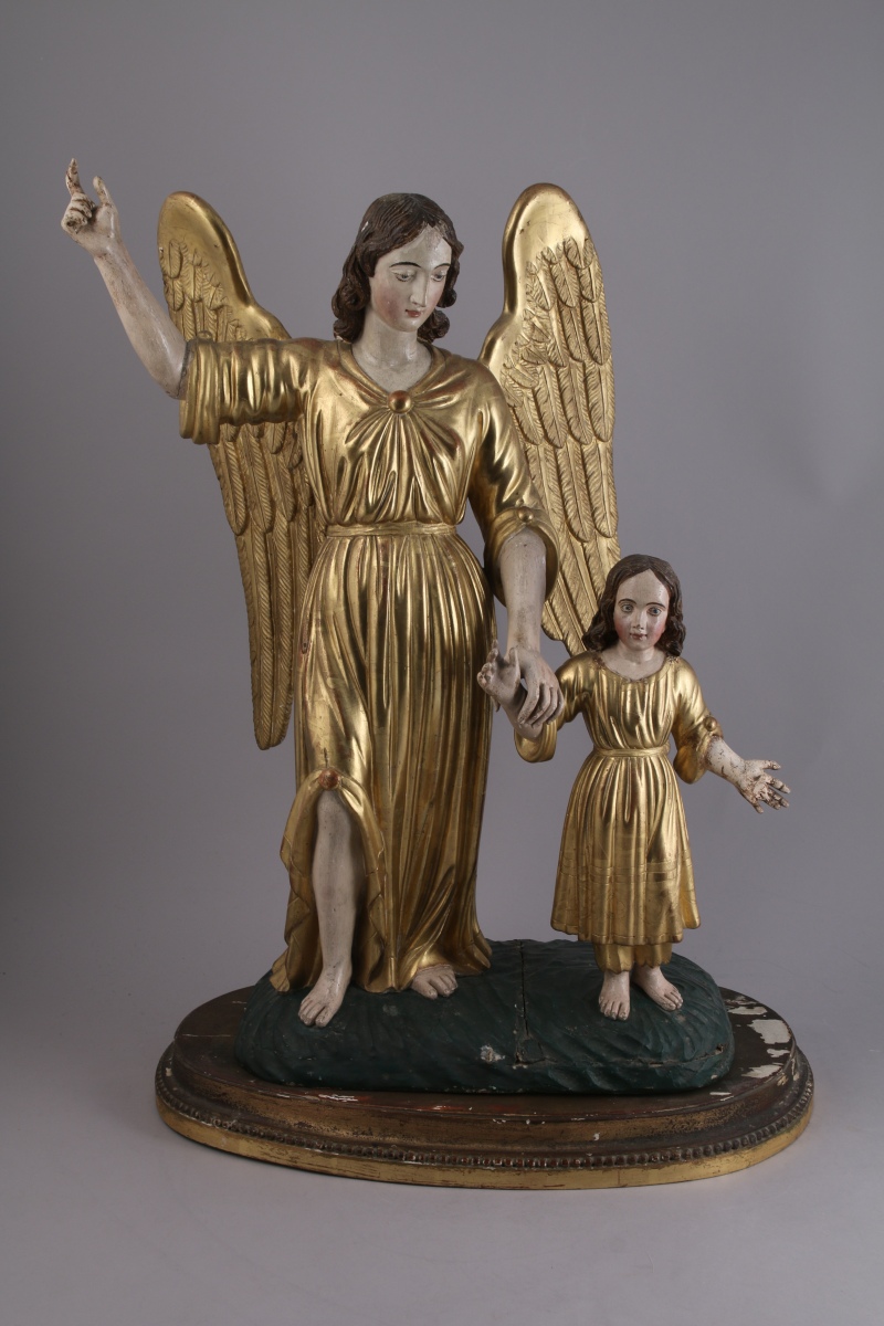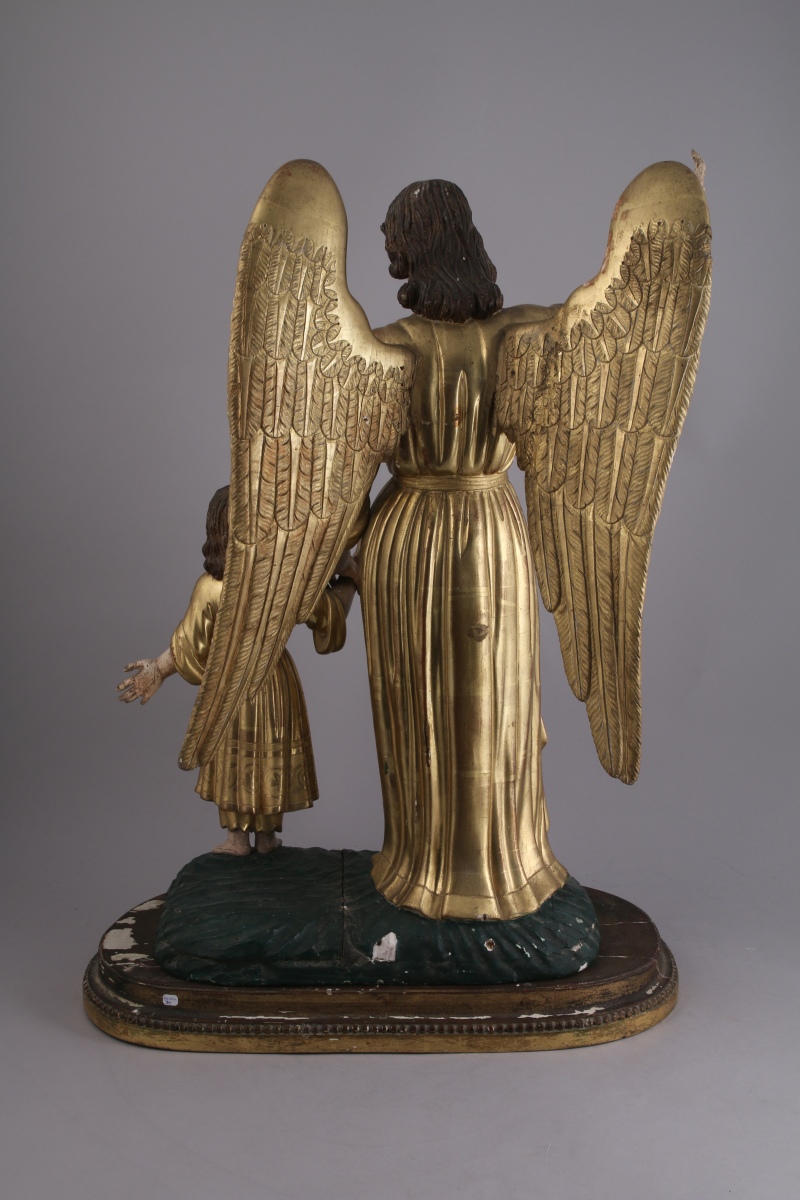 ANGE GARDIEN ET UN ENFANT, groupe en bois sculpté, stuqué polychrome et or. L'ange montrant le ciel à un enfant qu'il tient par le bras droit, les deux personnages debout sur un tertre.