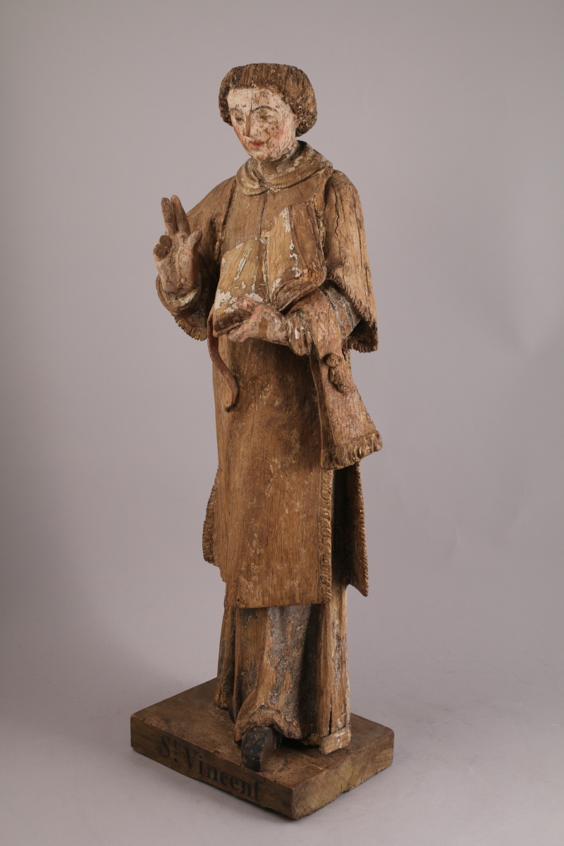 Debout sur un socle rapporté en hêtre, de forme rectangulaire, portant inscription de "St. Vincent".