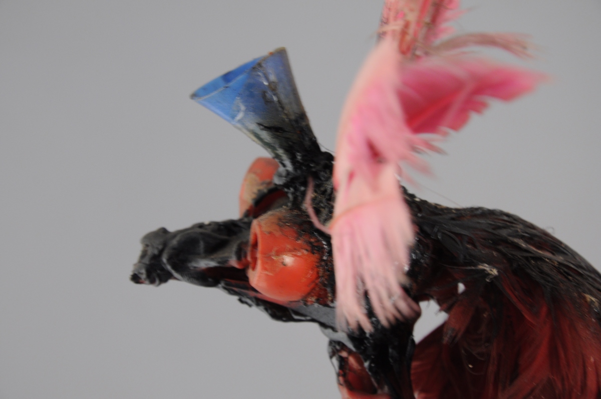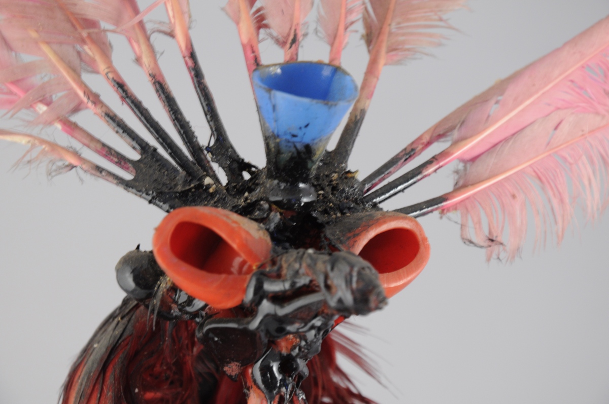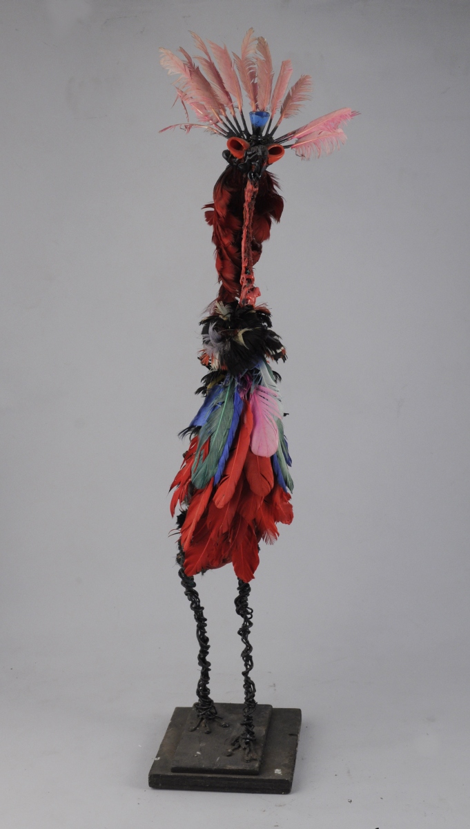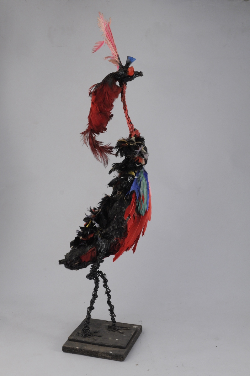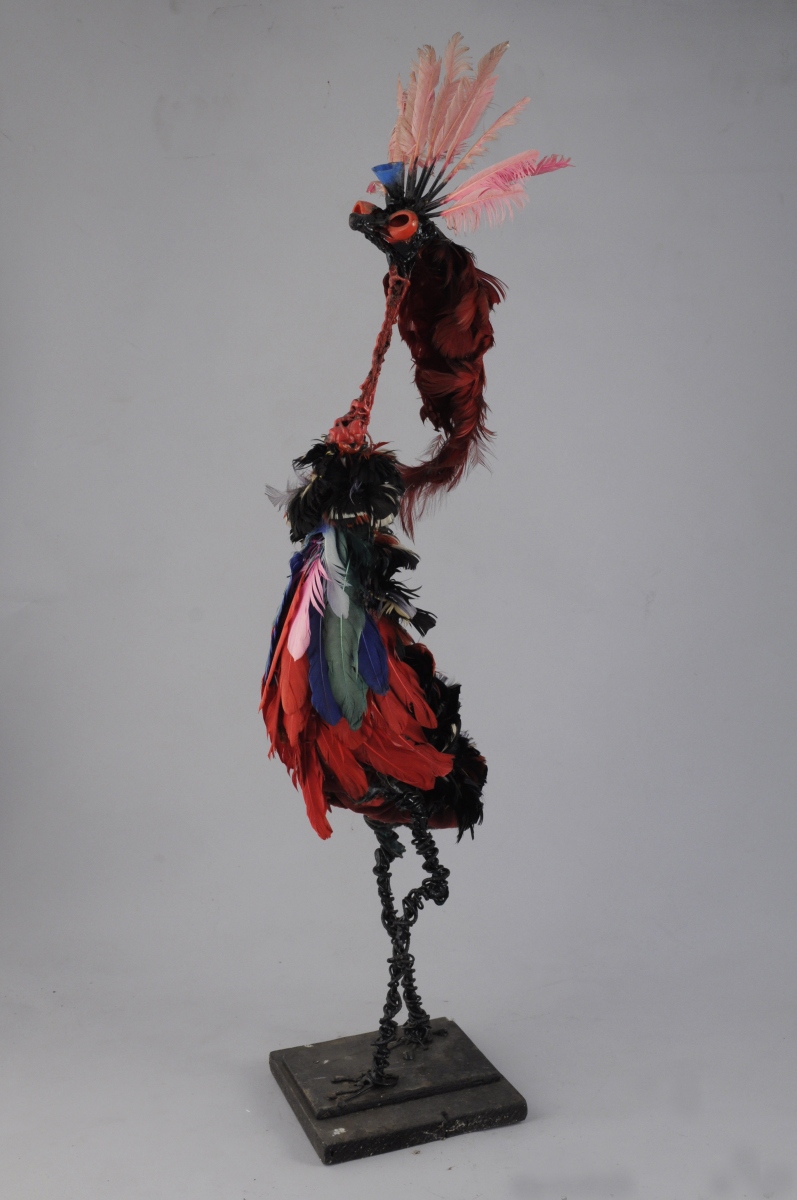 Sculpture en fil de fer, plumes, plastique, peinture noire sur socle de bois.
