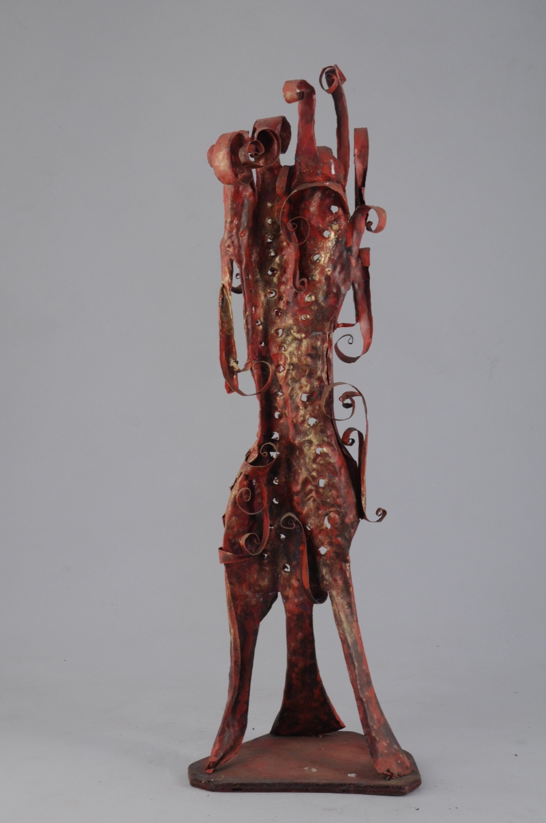 Sculpture en tôle peinte en rouge, or, signé sous la base et daté 1995