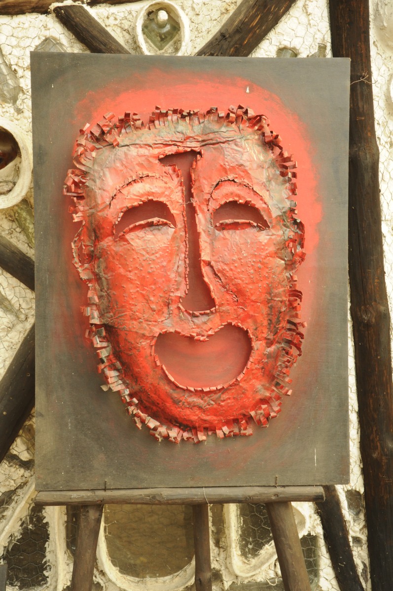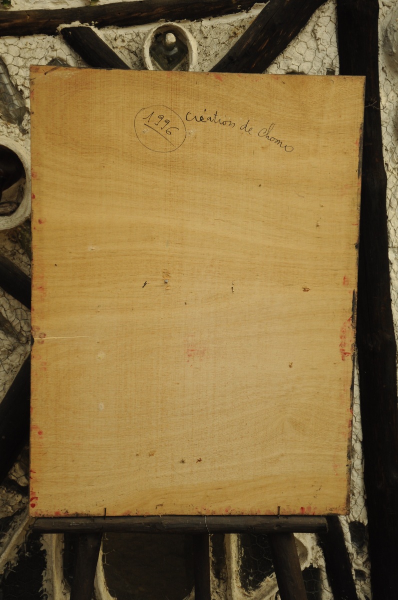 Bas-relief de tôle découpée peinte sur contre-plaqué, montage daté au dos 1996.