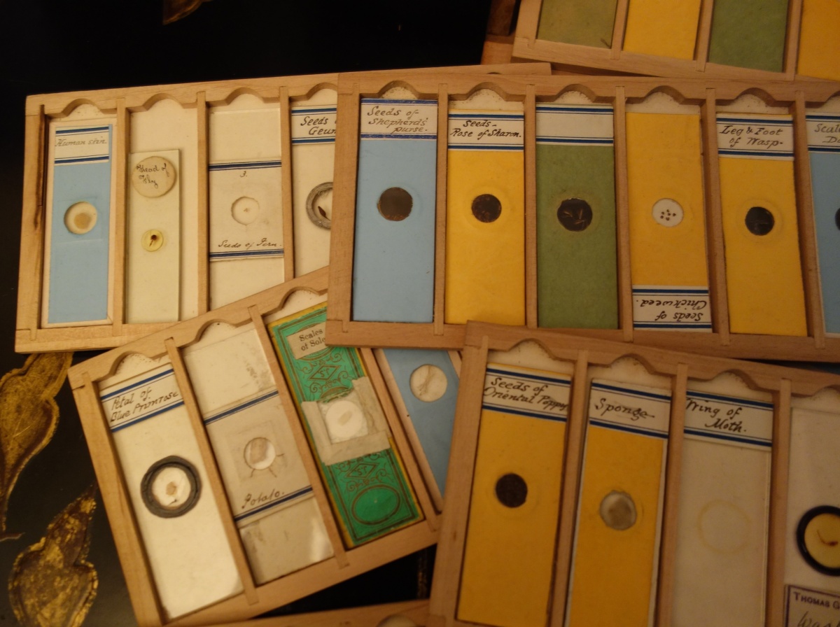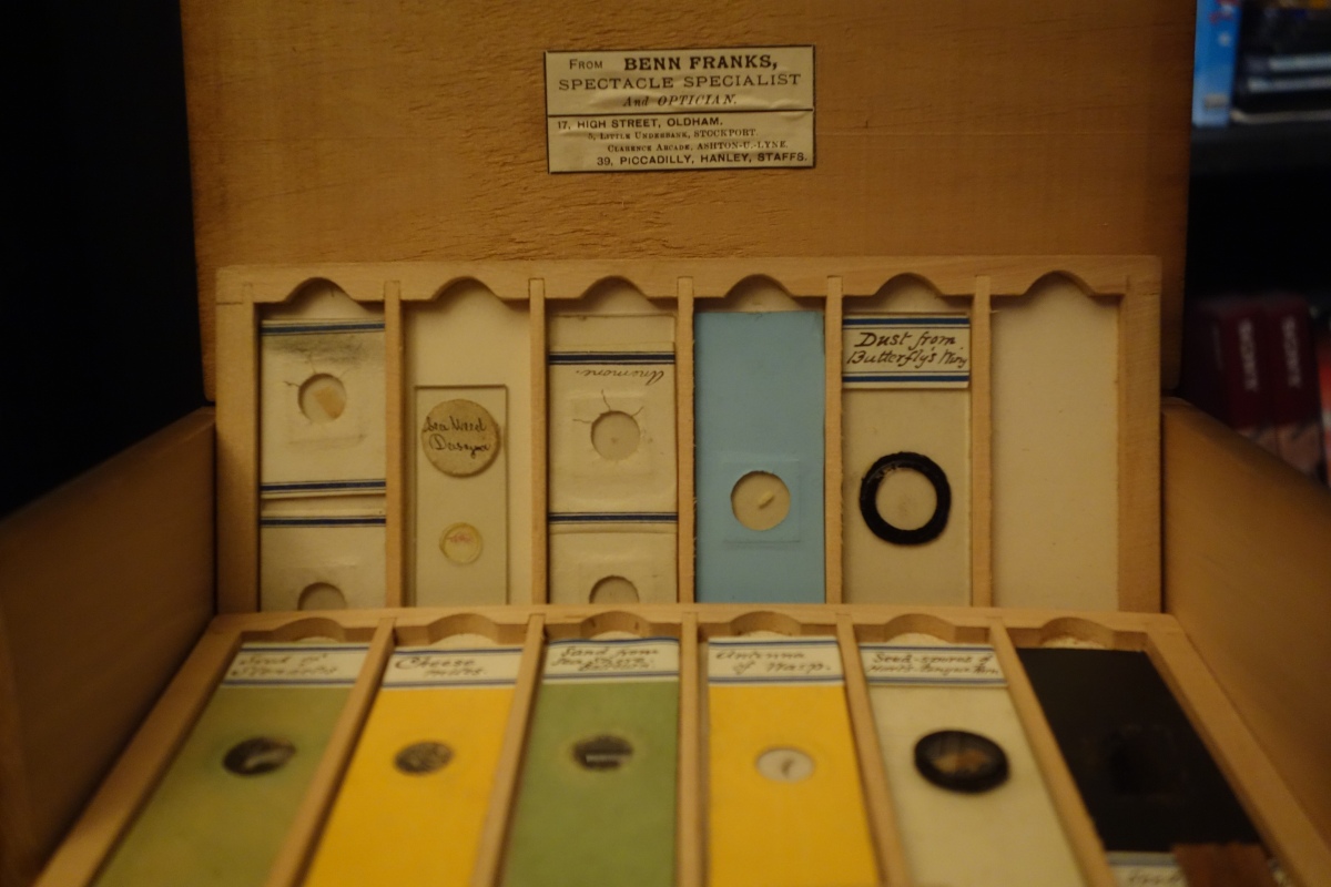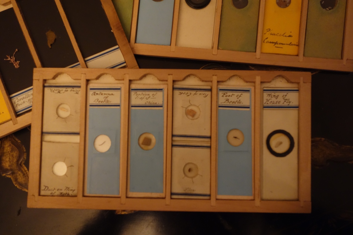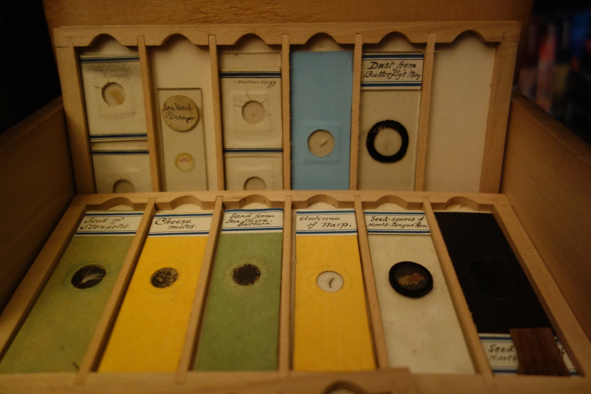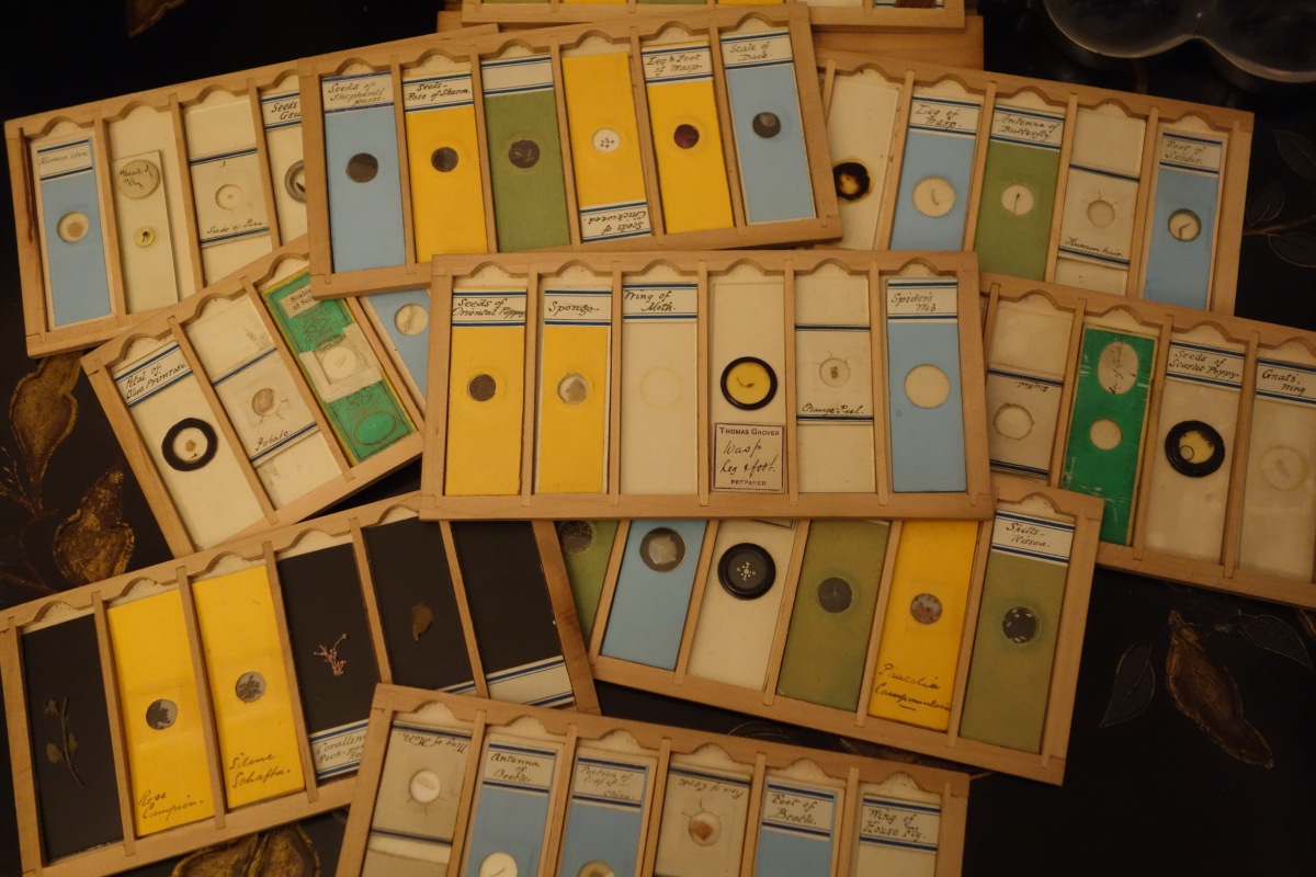 HISTOIRE NATURELLE. BENN FRANKS. Réunion d'environ 65 larves et graines dans un coffret de douze plateaux à 6 alvéoles chacun, en bois de pin.
