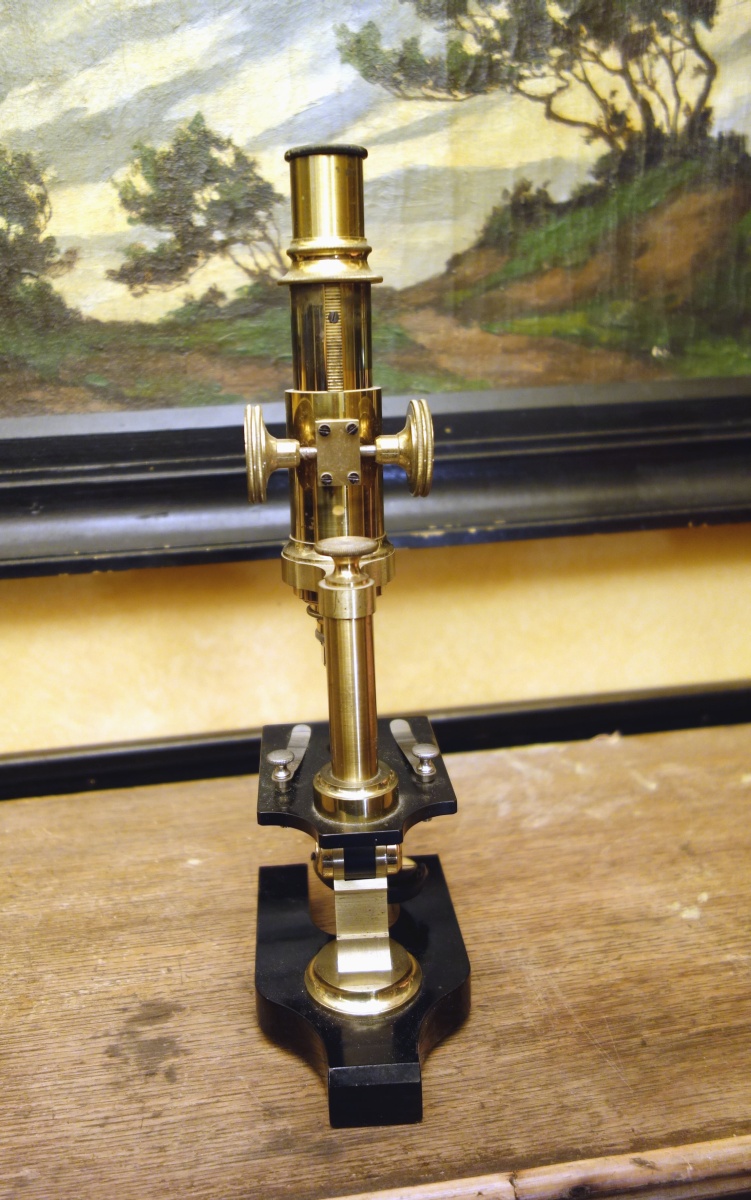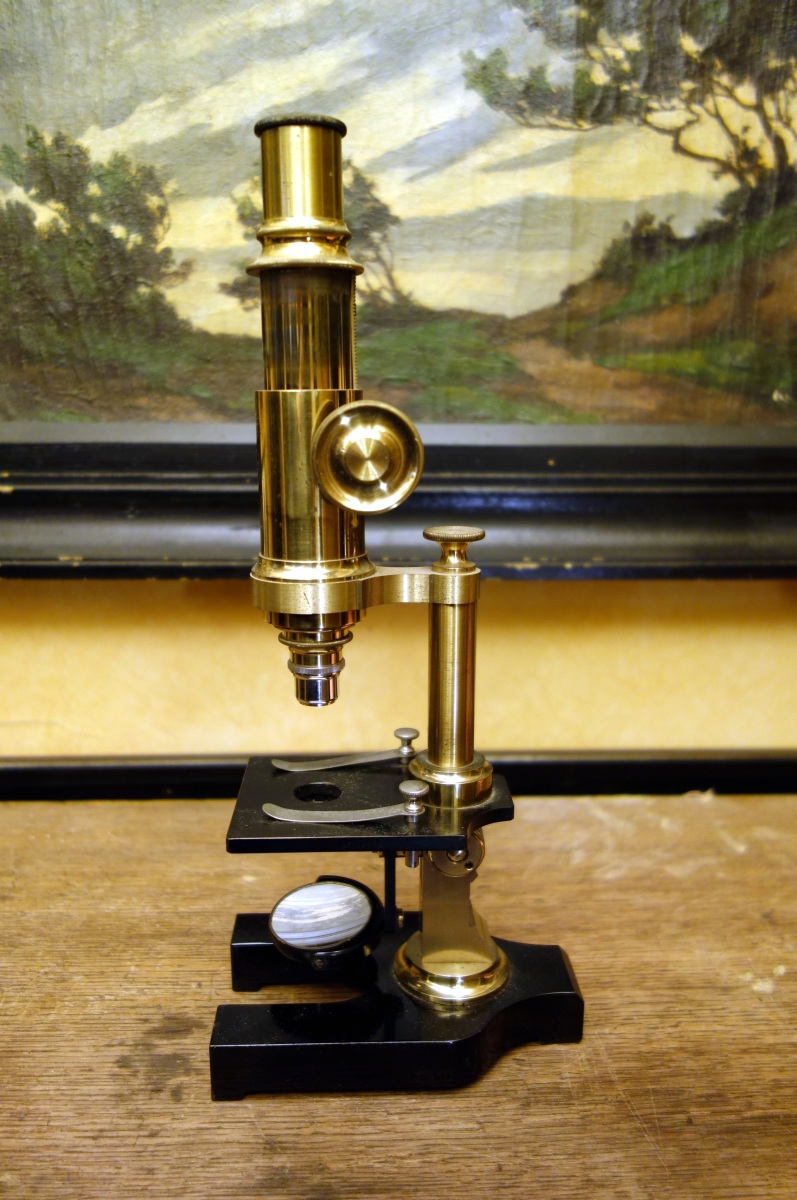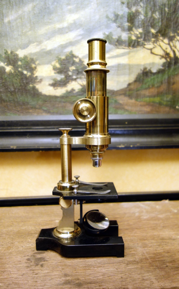 HISTOIRE NATURELLE. MICROSCOPE en laiton et acier à crémaillère.