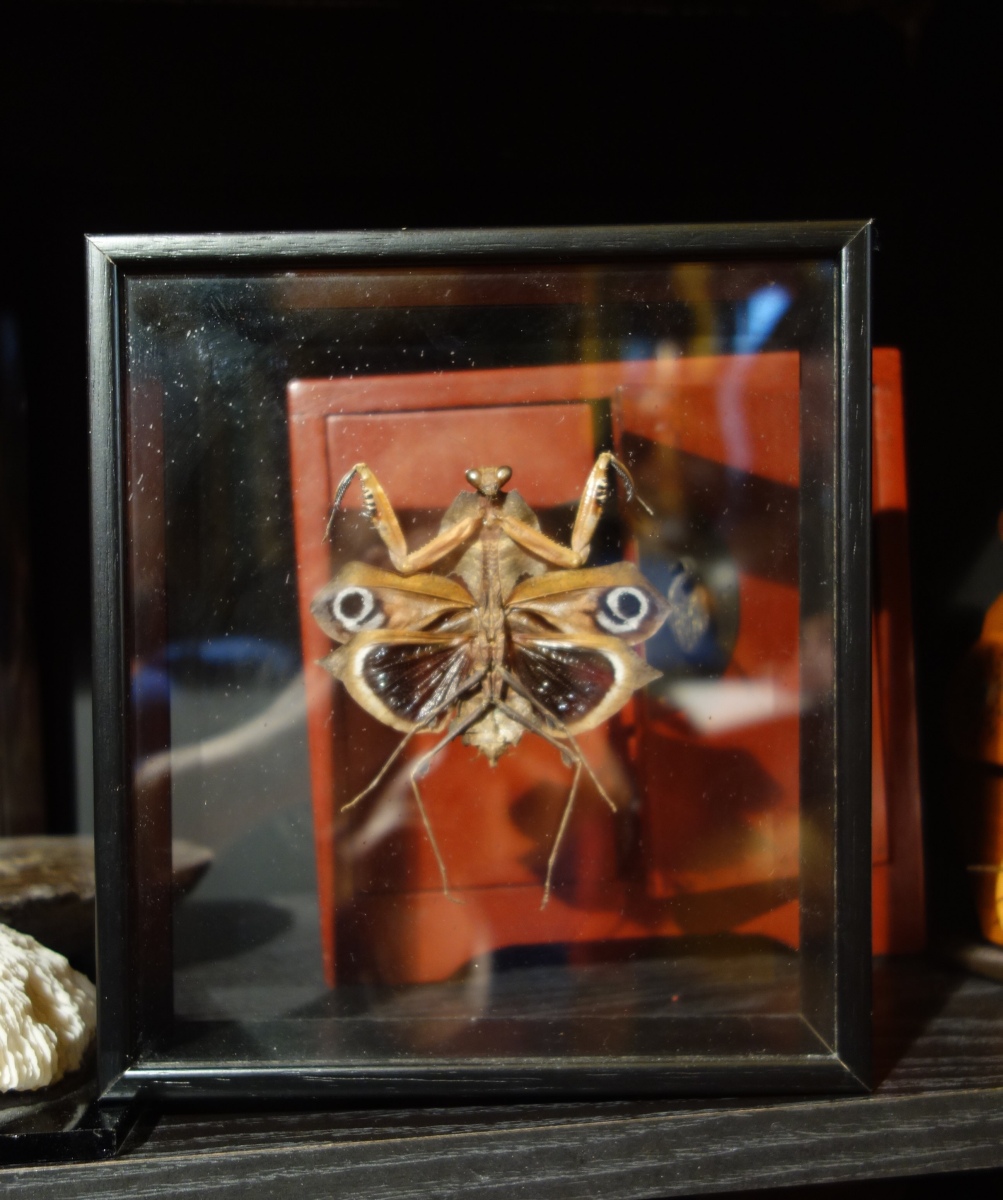 HISTOIRE NATURELLE. PAPILLONS du Pérou, Coquillages, Mante religieuse DEROPLATIS DESSICATA, graines et coraux.