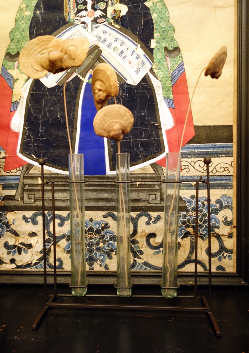 HISTOIRE NATURELLE. TROIS VASES avec des champignons séchés (Haut. 48...