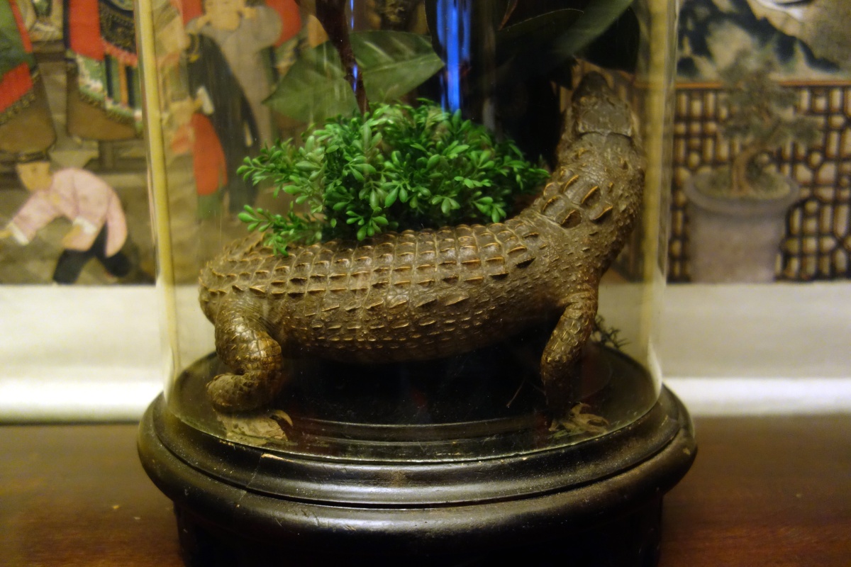 HISTOIRE NATURELLE. BUISSON d'oiseaux branchés poursuivi par un crocodile. Sous un globe.