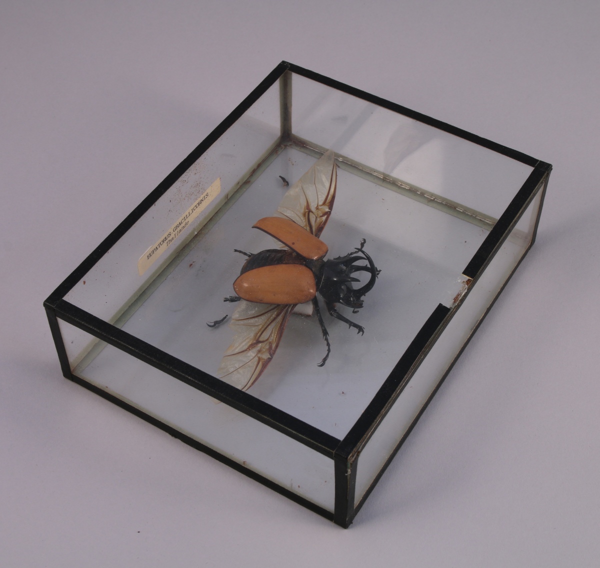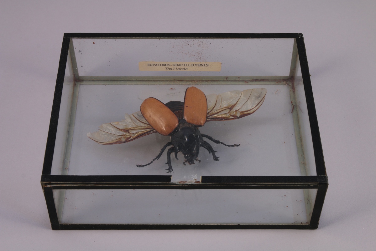 HISTOIRE NATURELLE. EUPATORUS GRACILLICORNIS- thaïlande naturalisé dans une boîte en verre.