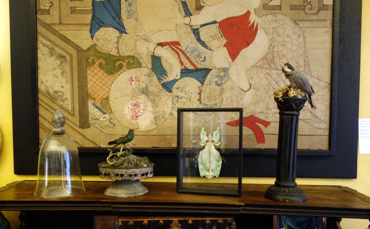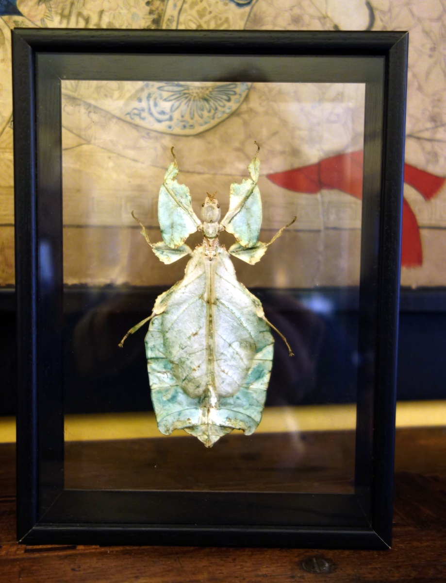 JOINT: PHASME PHYLLIUM GIGANTEUM (Malaisie) dans son cadre (12 cm), OISEAU naturalisé branché sur une colonne (30 cm).