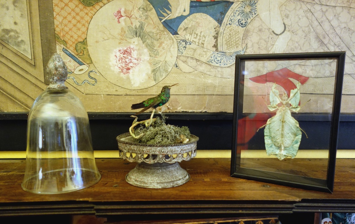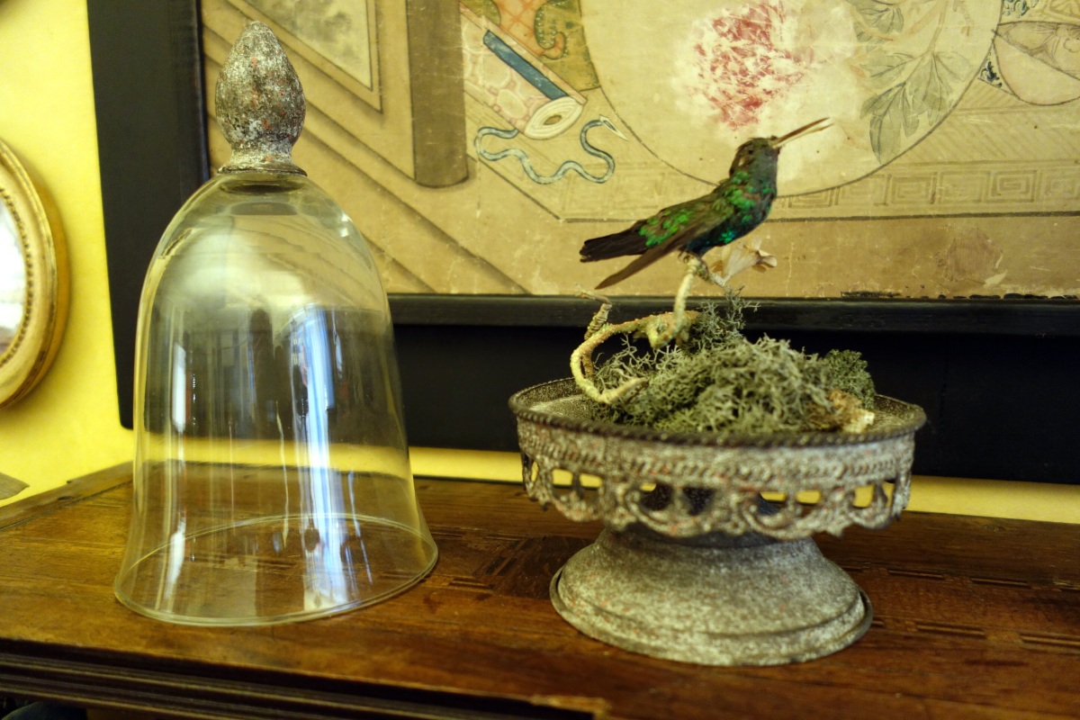 HISTOIRE NATURELLE. COLIBRI naturalisé sous une petite cloche à salade.