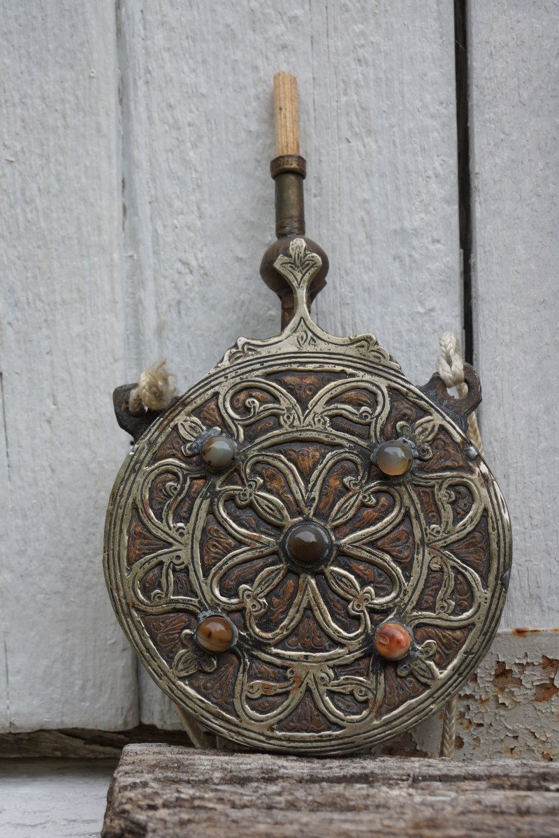 MOYEN-ORIENT (?) GOURDE à anses de forme circulaire en dinanderie de laiton et cuivre, à décor repoussé et ciselé de motifs floraux stylisés rayonnants ornés de cinq pierres dures en cabochon. Le verso agrémenté d'une rosace.
