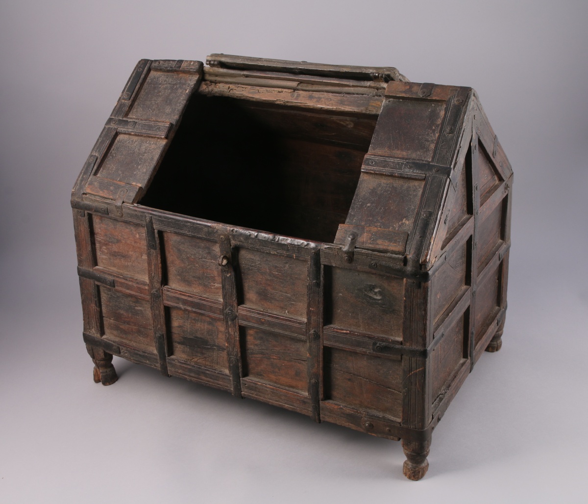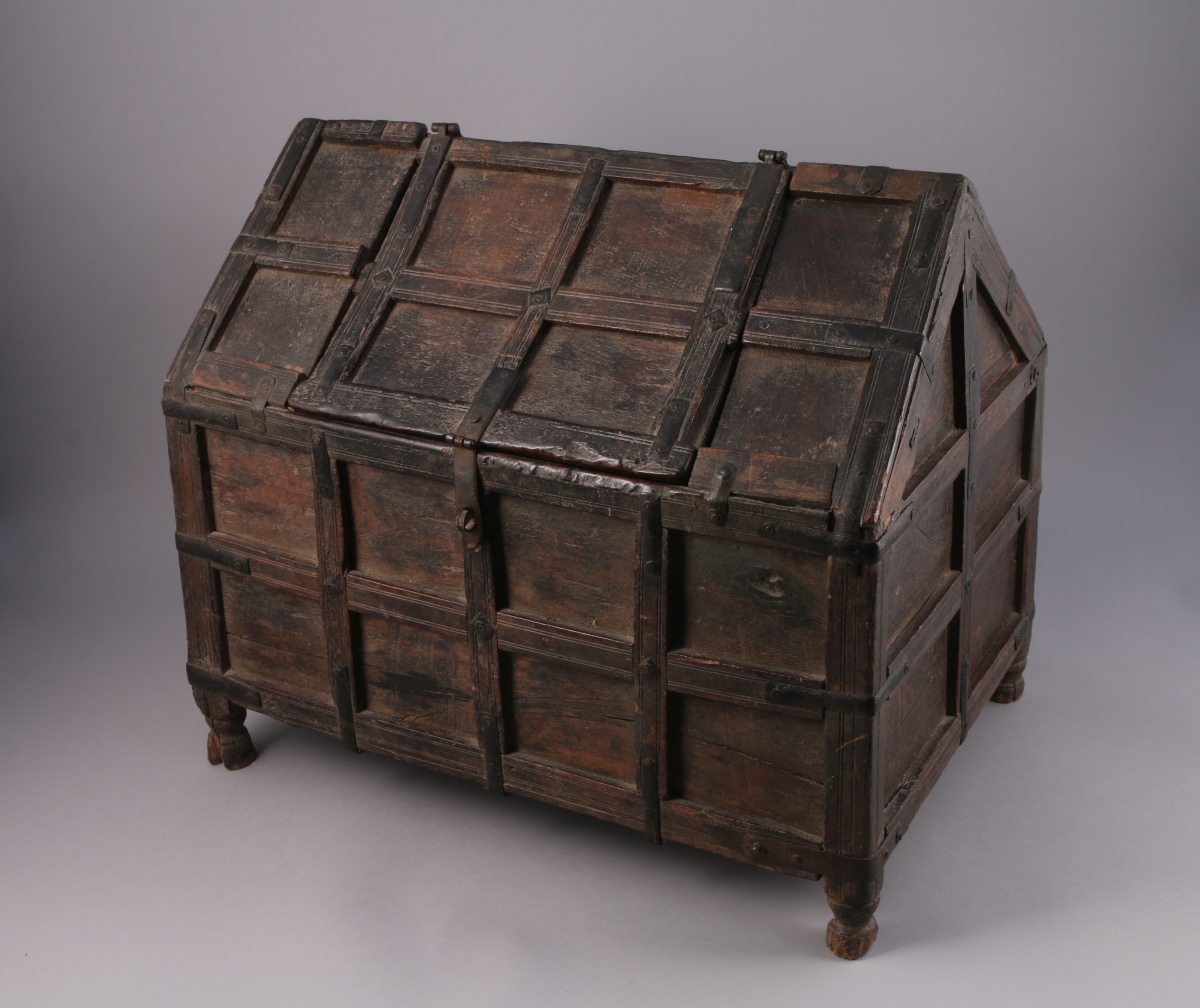 AFGHANISTAN. COFFRE en forme de châsse en bois mouluré et ferrures. Il ouvre à un vantail en partie supérieure.