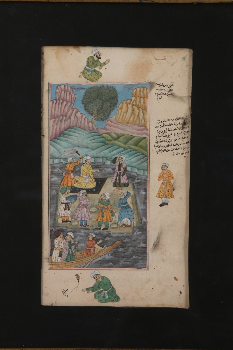 PERSE. PAGE ENLUMINÉE figurant des hommes dans un paysage lacustre, des mentions manuscrites dans la marge.