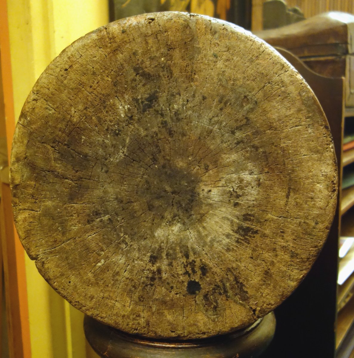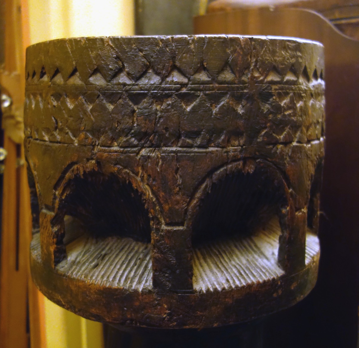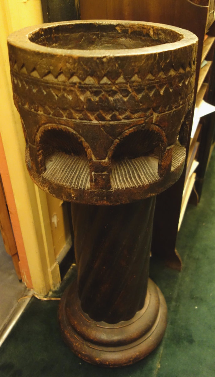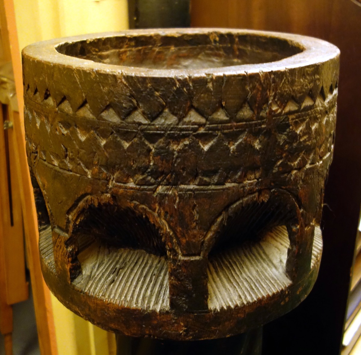 AFRIQUE. MORTIER de forme circulaire en bois sculpté. Le côté orné de huit arches striées.