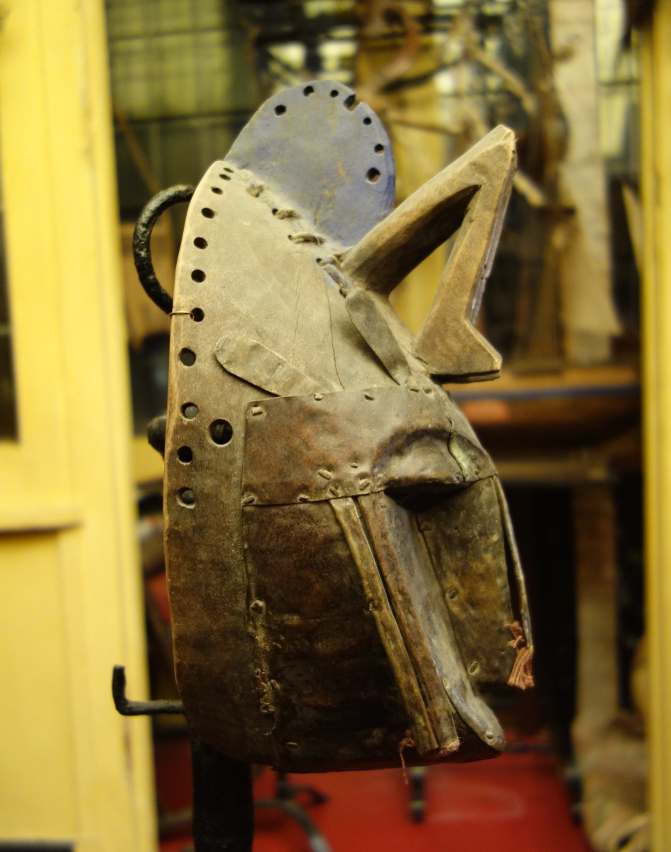 AFRIQUE. MASQUE en bois, cuivre, fibres.