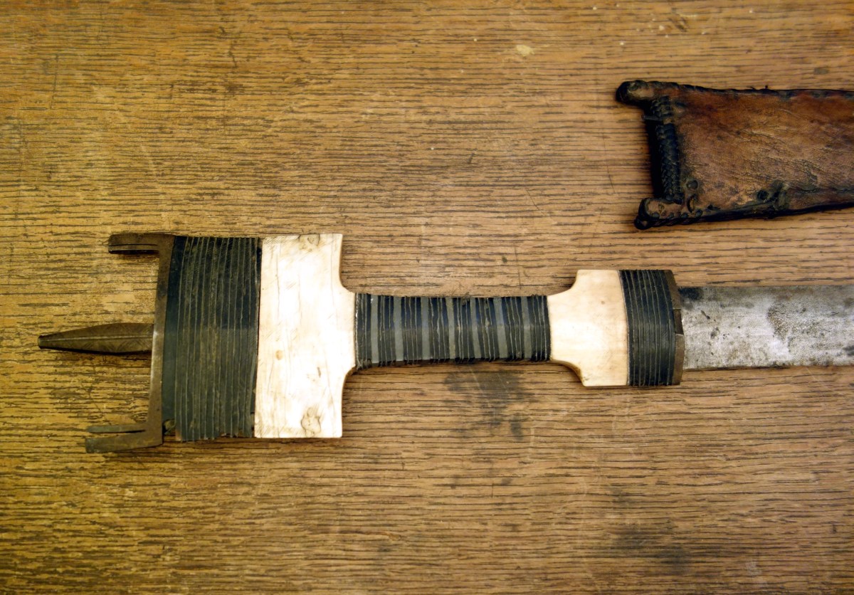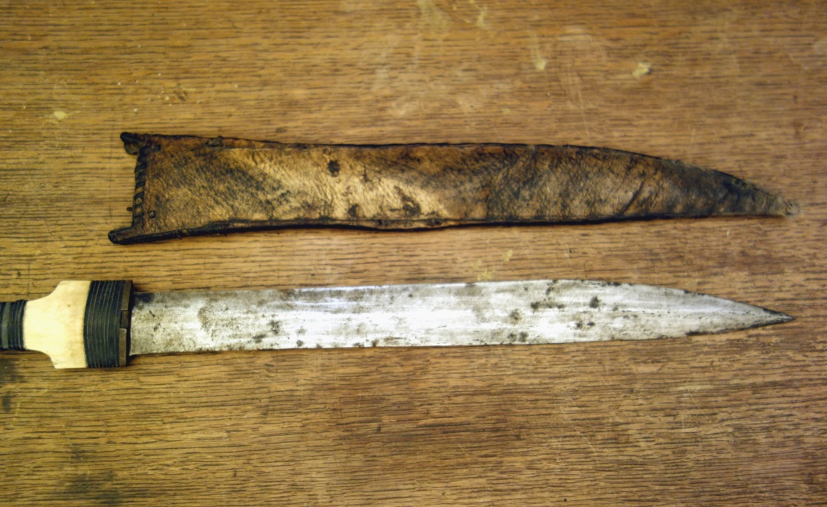 AFRIQUE du NORD. POIGNARD en fer, os, ébène. Fourreau en cuir.
