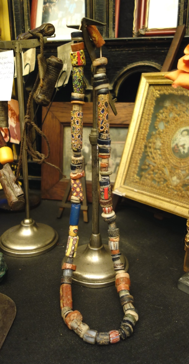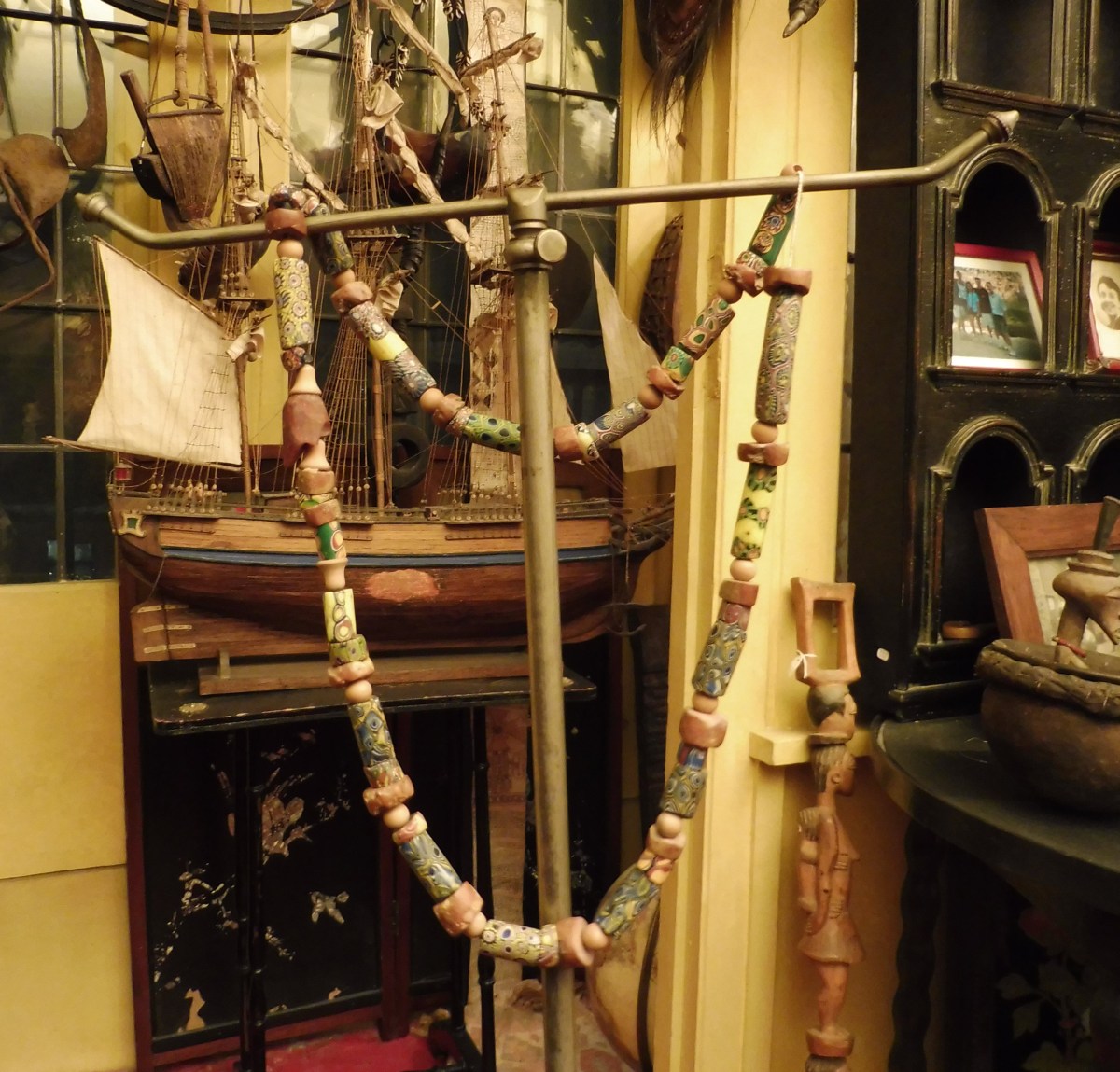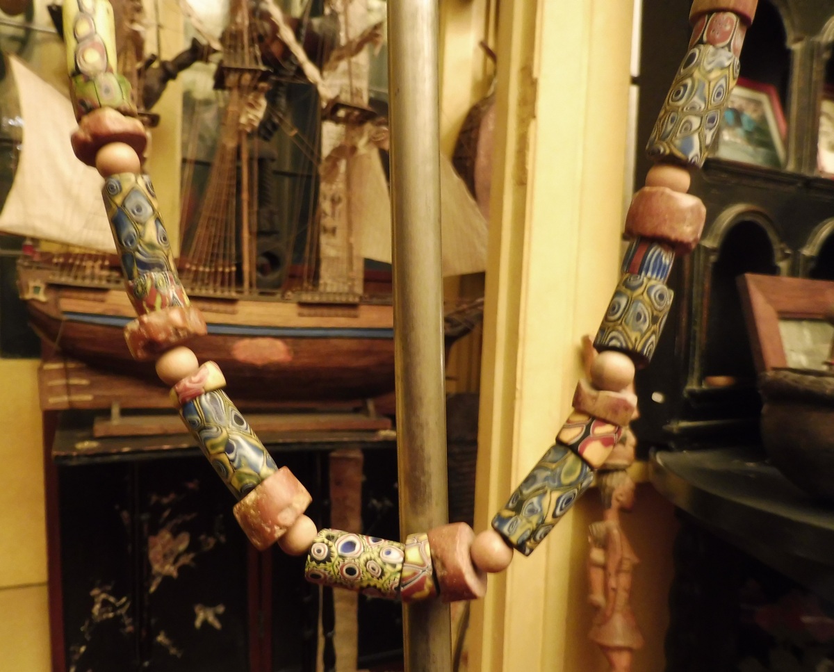 "À lépoque, il [le collier] avait en effet une très grande valeur marchande presque égale à celle des armes à feu dans les échanges desclaves entre les rois africains et les négriers venus par bateau au large de lîle de Gorée proche de la Mauritanie et du Sénégal, pour essaimer ensuite leur cargaison humaine vers Saint Domingue et la Caraïbe ainsi que le Sud des Etats-Unis [6]. Ces esclaves avaient été capturés au cours de razzias systématiquement menées par ces rois africains, musulmans pour la plupart, bien rôdés par dix siècles dexactions de ce type pour alimenter la traite des esclaves noirs vers le Maghreb et le Maroc en particulier. Du XVIe au XIXe siècle, quinze millions desclaves furent extraits comme le lait du sein de lAfrique, extraits pour donner le mot traite. En échange de ce bois débène, (tournure pudiquement utilisée pour parler des esclaves), ces rois africains recevaient ces colliers produits dans les verreries de Murano ou de Bohême tournant à plein régime pour ce commerce, mais aussi des armes, de la poudre, de la quincaillerie, des étoffes tissées pour le continent africain et même dimportantes quantités deau de vie. Au retour, les navires, pour ne pas revenir à vide, ramenaient du sucre de canne, du café, du cacao, du tabac, vers lEurope chrétienne entière dans le cadre de ce que lon a appelé le commerce triangulaire. Verroterie contre bois débène, bois débène contre sucre et café, sucre."