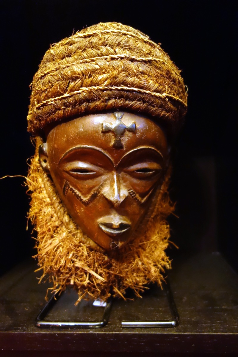 ANGOLA - TSHOKWE. MASQUE PWO scarifié en bois sculpté, la coiffe en raffia.