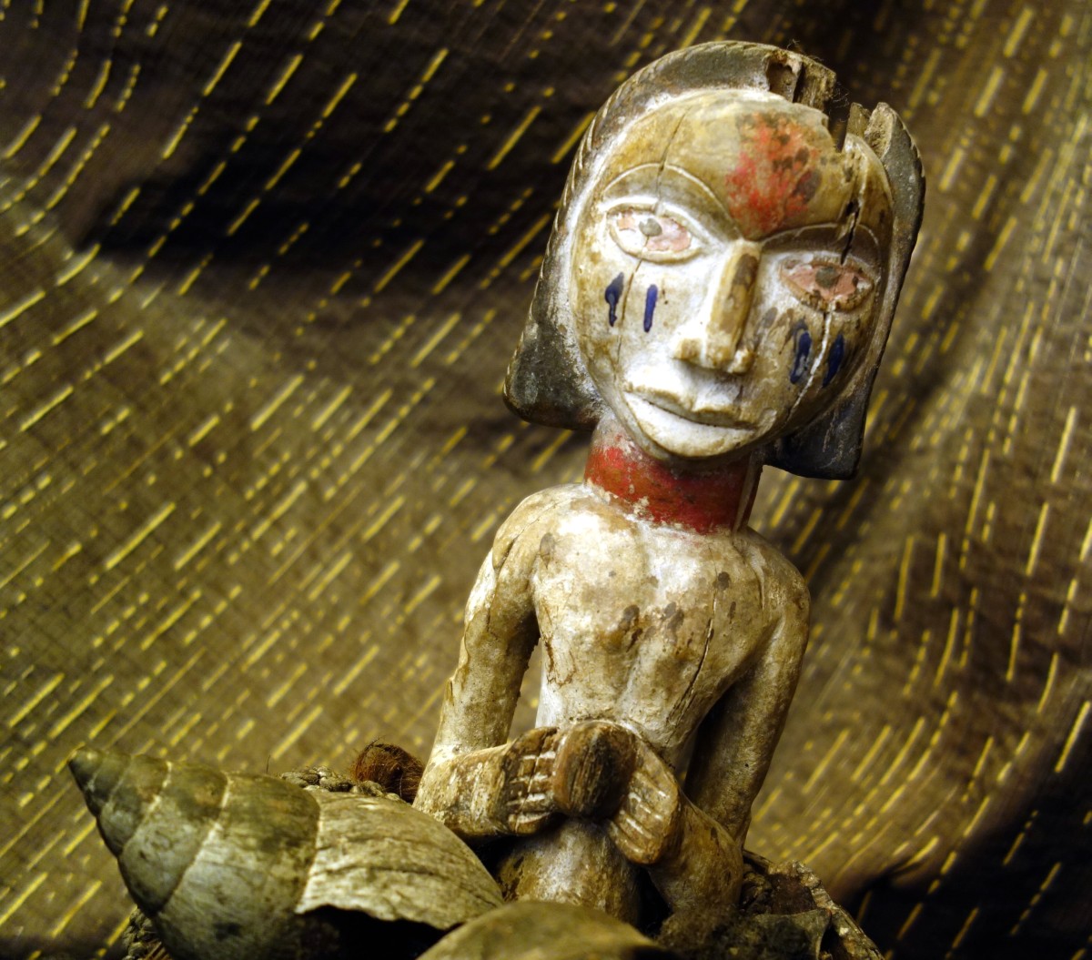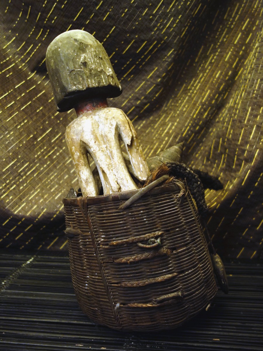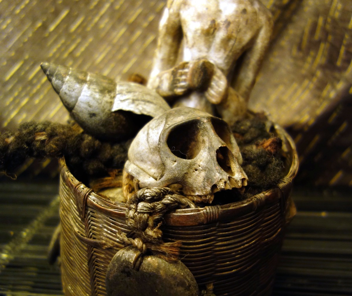 GABON. RELIQUAIRE VAUDOU, dans un panier en osier, une statue en bois sculpté polychrome, crâne de singe, diverses cordes, étoupes, os, minéraux, coquillages