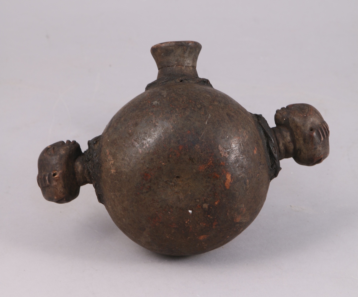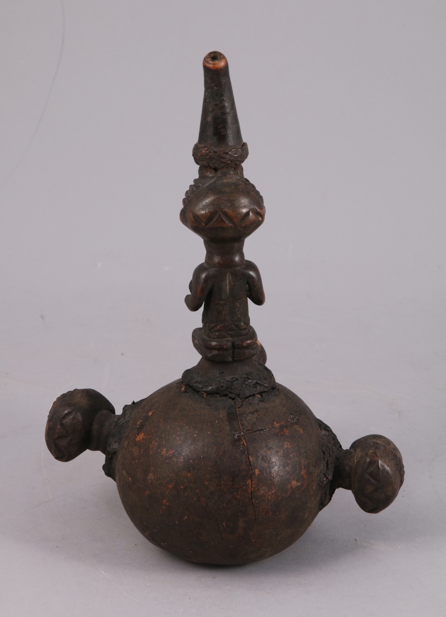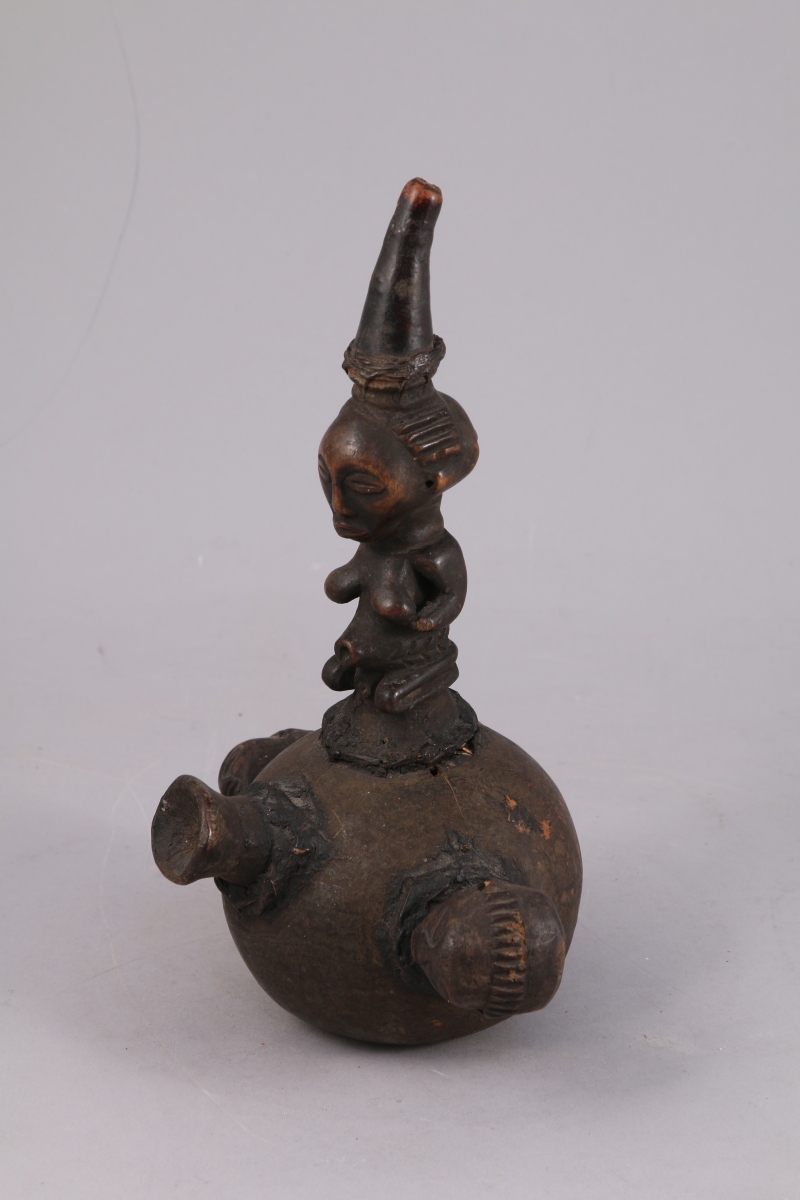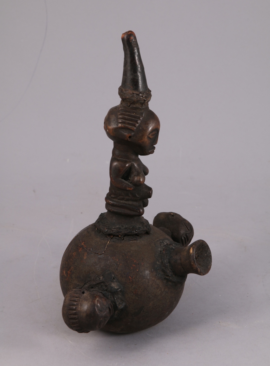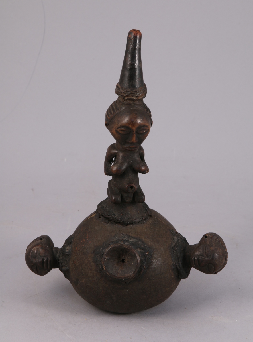 CONGO - LUBA. PIPE en bois sculpté et fibres. La tige figurant une femme au nombril proéminent, le foyer bombé à anses antropomorphes.