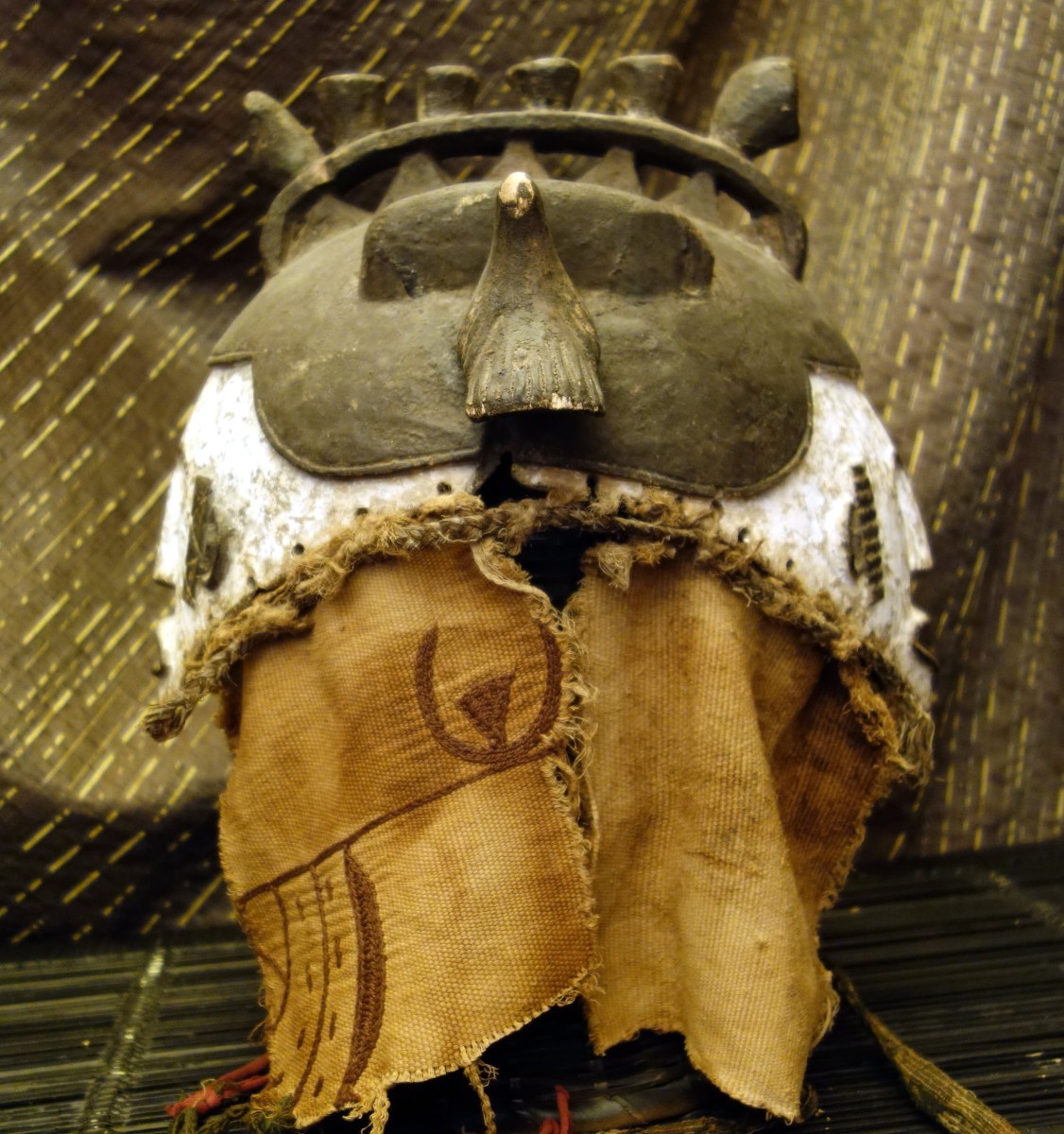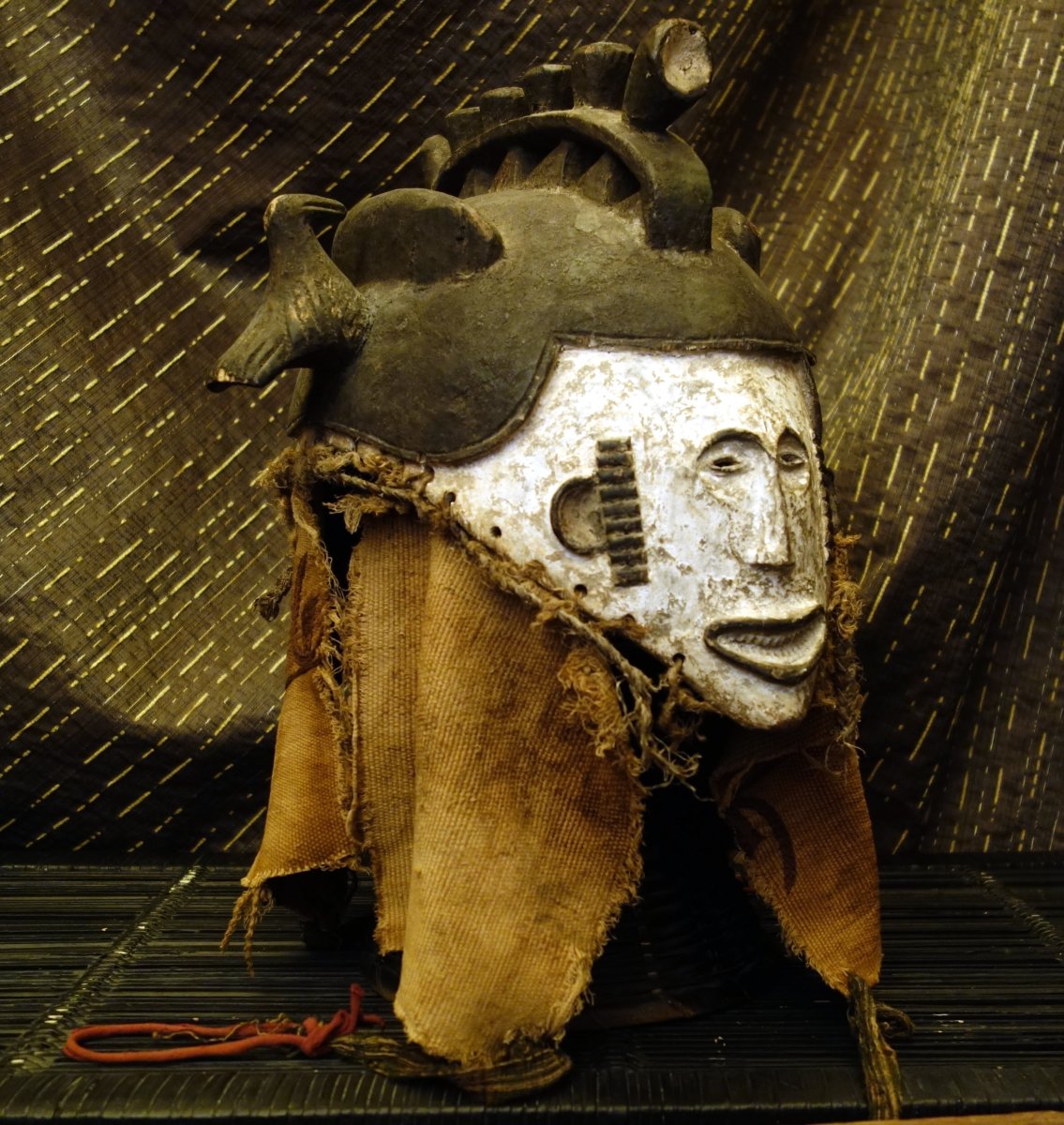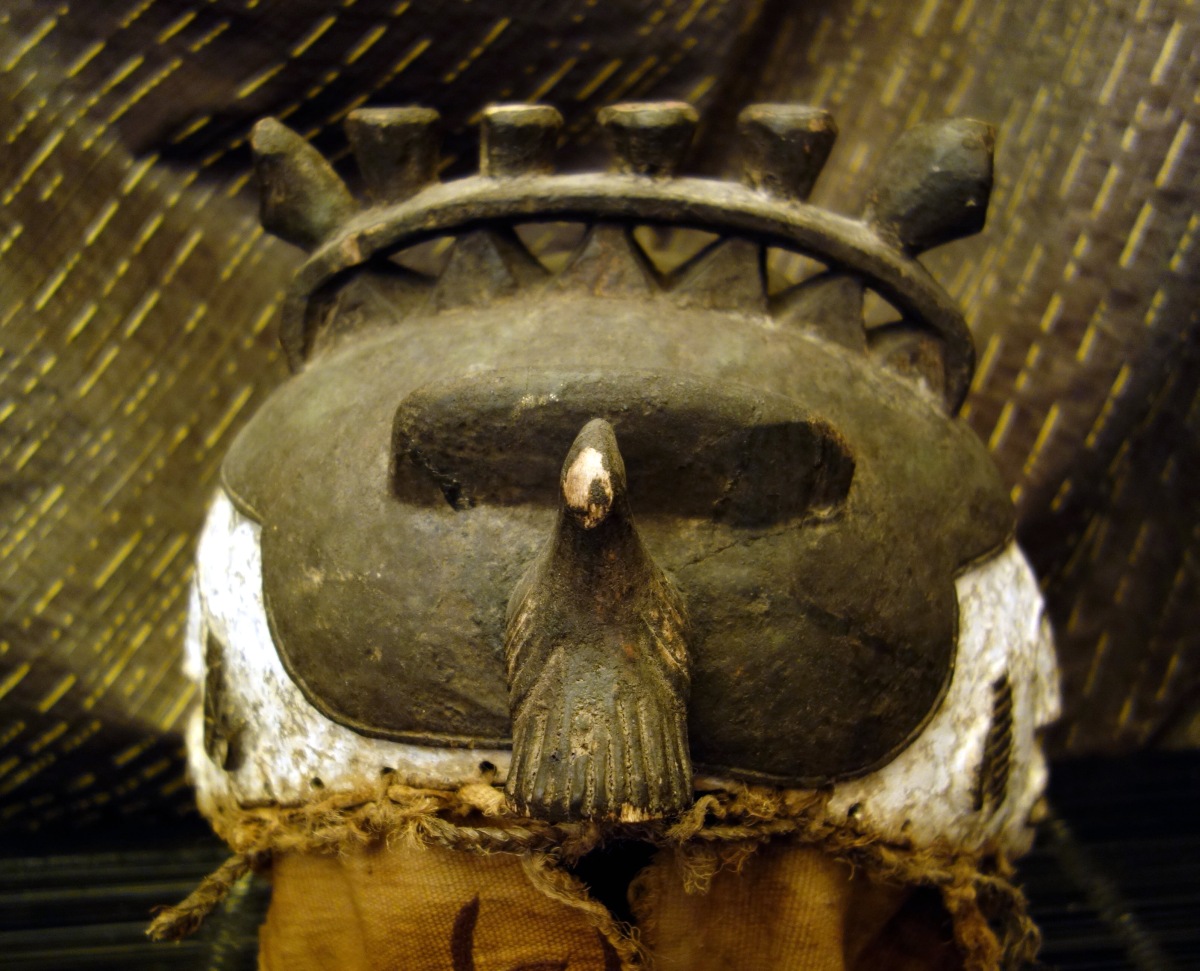 NIGÉRIA - IBO. MASQUE JANUS en bois sculpté et kaolin. Coiffe en fibre tressée.